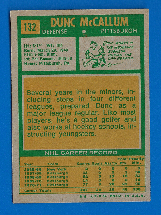 1971 Topps Hockey Card #132 Dunc McCallum Pittsburgh Penguins EXMT Last Card in series Shipped in a toploader in a PWE. Alternate shipping methods can be requested. Photos of actual card that you will receive. Additional photos available upon request. Please check out the other items in my store. I have a large collection of sports and non-sports related items.