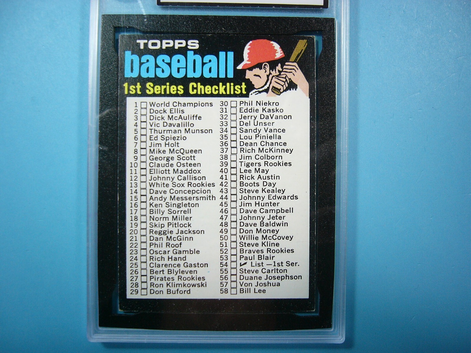 YOU ARE BIDDING ON A 1971 TOPPS TRADED HIGH-NUMBERED MLB BASEBALL CAR D #54 FIRST 1ST SERIES CHECKLIST CARD. CARD IS GRADED 7 BY KSA IN NEAR MINT CONDITION. COMPLETELY UNCHECKED BOTH FRONT AND BACK. SEE SCANS FOR FURTHER CONDITION GREAT COLOUR & GLOSS--A VERY SHARP, CLEAN & ATTRACTIVE IMPORTANT CARD FROM THIS VALUABLE VINTAGE TOPPS BASEBALL SET!!! THANK YOU FOR LOOKING AND GOOD LUCK!!! -------------------------------------------------------------------------------------------------------------------------------- SHIPPING WITHIN CANADA IS $4.99. SHIPPING TO THE UNITED STATES IS $8.99 AND INCLUDES TRACKING & INSURANCE. SHIPPING INTERNATIONALLY (ANYWHERE ELSE) IS $25.00 AND INCLUDES TRACKING & INSURANCE. ITEM WILL BE CAREFULLY PACKAGED SO AS NOT TO GET DAMAGED DURING SHIPPING. IF YOU ARE IN CANADA AND WOULD LIKE SHIPPING WITH TRACKING & INSURANCE INCLUDED COST IS $12.99. PLEASE CONTACT US BEFORE PAYMENT IS MADE TO ADJUST THE INVOICE ACCORDINGLY. WE DO COMBINE SHIPPING ON MULTIPLE PURCHASES--ONLY $1.00 MORE FOR EACH ADDITIONAL SINGLE GRADED CARD OR ONLY 25 CENTS MORE FOR EACH ADDITIONAL SINGLE UNGRADED CARD. TAKE A LOOK AT OUR OTHER AUCTIONS AND SAVE ON SHIPPING!!!