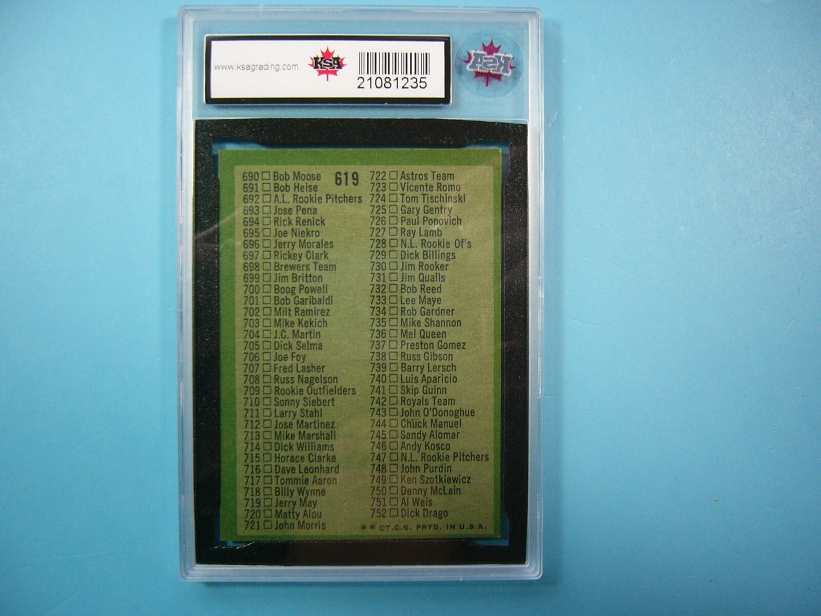 YOU ARE BIDDING ON A 1971 TOPPS SEMI HIGH-NUMBERED MLB BASEBALL CAR D #619 SIXTH / 6TH SERIES CHECKLIST CARD. CARD IS GRADED 7.5 BY KSA IN NEAR MINT+ CONDITION. COMPLETELY UNCHECKED BOTH FRONT AND BACK. SEE SCANS FOR FURTHER CONDITION GREAT COLOUR & GLOSS--A VERY SHARP, CLEAN & ATTRACTIVE VERY IMPORTANT CARD FROM THIS VALUABLE VINTAGE TOPPS BASEBALL SET!!! THANK YOU FOR LOOKING AND GOOD LUCK!!! -------------------------------------------------------------------------------------------------------------------------------- SHIPPING WITHIN CANADA WITH TRACKING & INSURANCE IS $12.50, TO THE UNITED STATES $15.00 AND INTERNATIONALLY $60.00 (EVERYWHERE ELSE). ITEM WILL BE CAREFULLY PACKAGED SO AS NOT TO GET DAMAGED DURING SHIPPING. WE DO COMBINE SHIPPING ON MULTIPLE PURCHASES--ONLY 50 CENTS PER ADDITIONAL GRADED CARD OR ONLY 20 CENTS MORE PER ADDITIONAL SINGLE UNGRADED PHOTO OR CARD. TAKE A LOOK AT MY OTHER AUCTIONS AND SAVE ON SHIPPING!!!