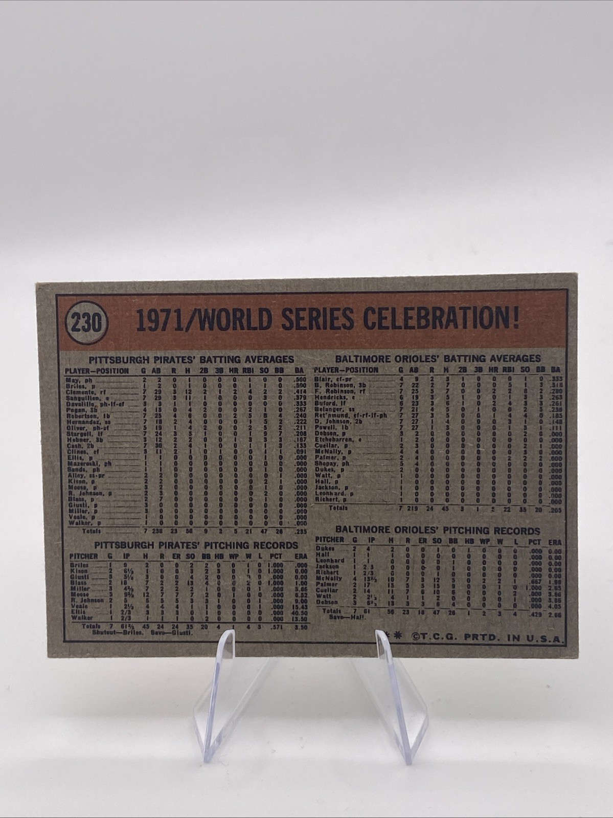 The product is a vintage 1972 Topps #230 trading card from the Series Celebration set, commemorating the 1971 World Series between the Pittsburgh Pirates and Baltimore Orioles. The card features Roberto Clemente of the Pittsburgh Pirates and is a single original card made of card stock. This baseball trading card is a part of the Major League (MLB) and is a base set card manufactured by Topps in the United States. Perfect for collectors of sports memorabilia, this card celebrates a historic event in baseball history.
