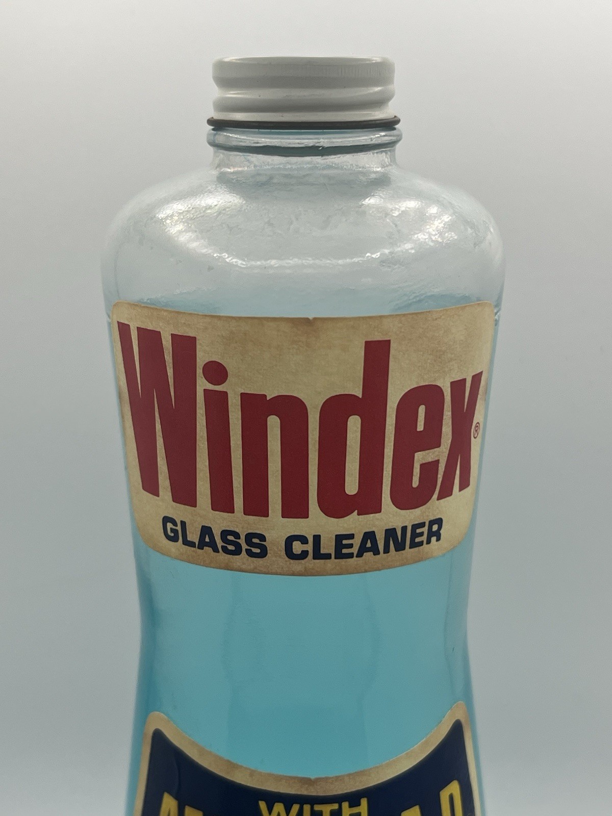 This vintage Windex glass bottle from 1973 is a great addition to any collection of household cleaning products. The paper label on the bottle showcases the product's history and adds to its charm. This bottle is perfect for display or for use as a unique container. This is mostly full vintage.