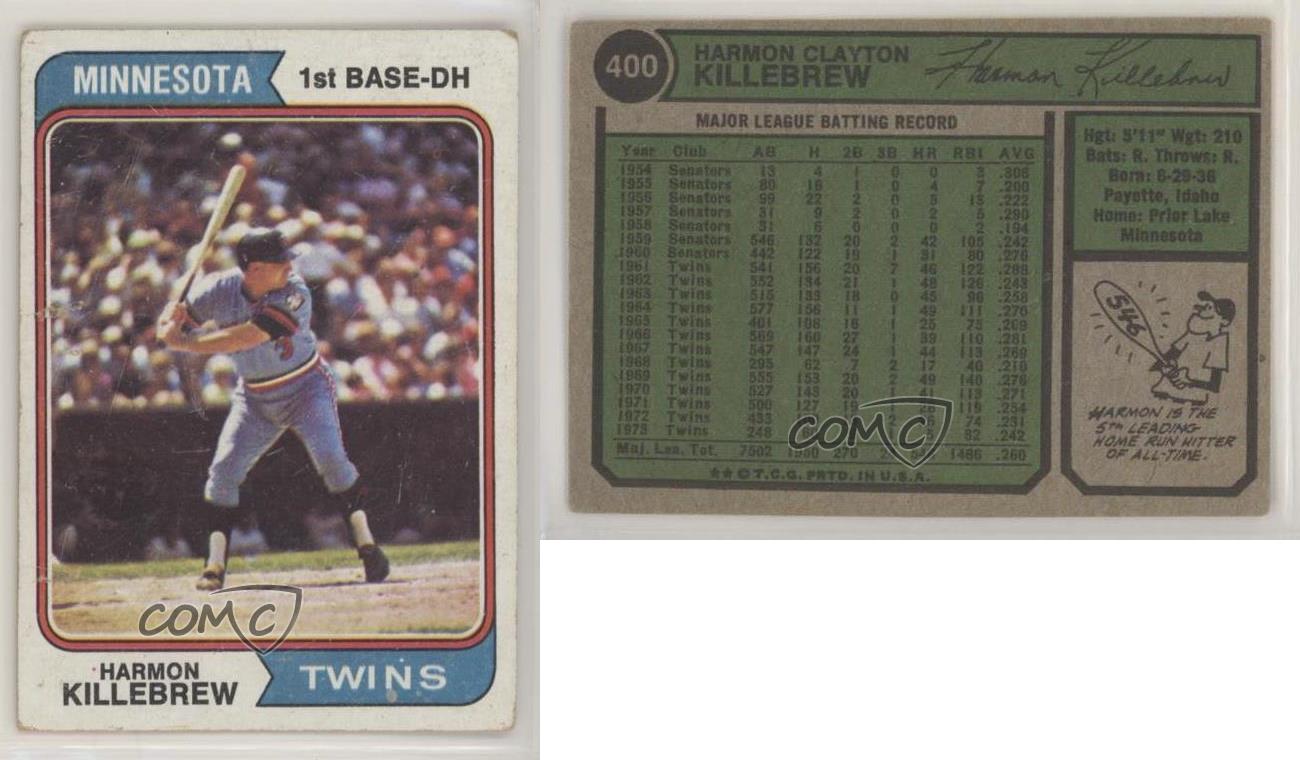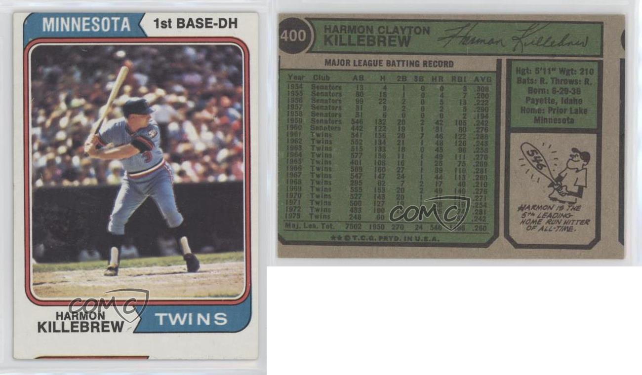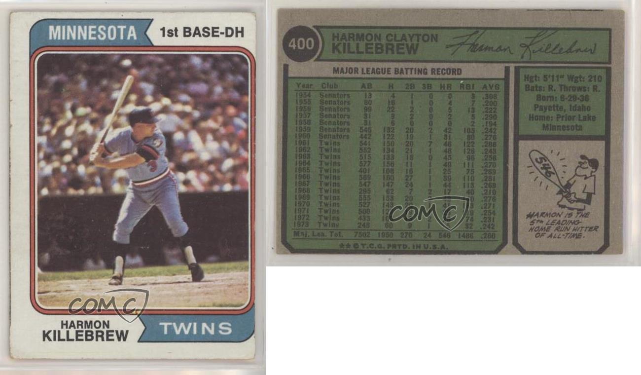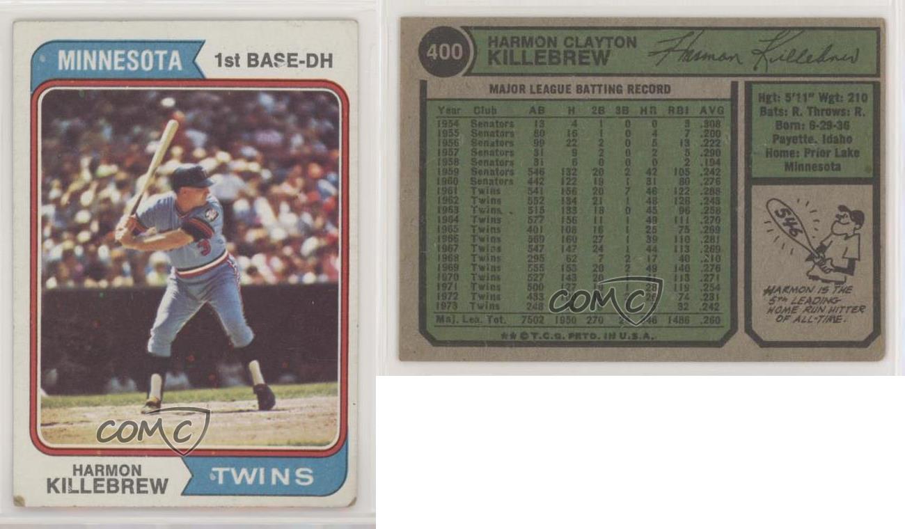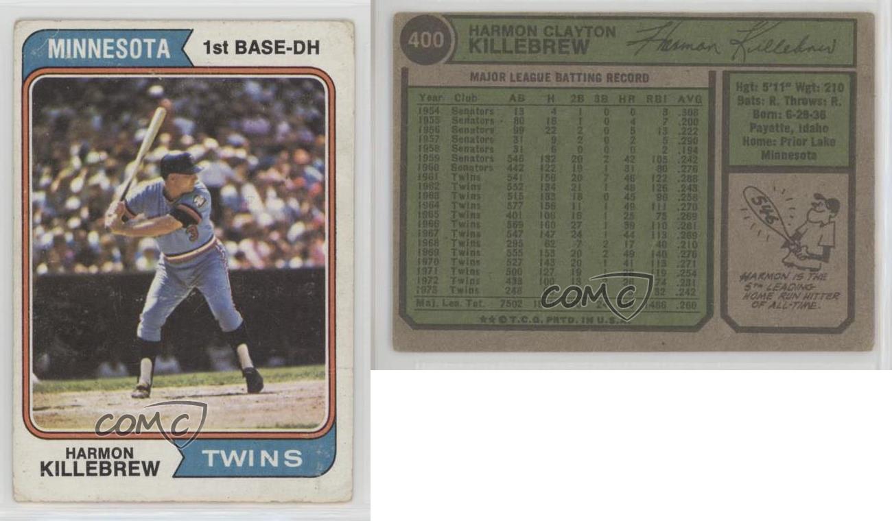 1974 Topps - [Base] #400 Harmon Killebrew - Baseball Card - Featuring the Minnesota Twins - Featuring Harmon Killebrew Search for more: 1974 Topps Search for more: 1974 Topps - [Base] View all of our Listings Auctions Buy It Now About Us Located in the beautiful Pacific Northwest, COMC (Check Out My Cards) is the world's largest consignment service for trading card singles. More than 10,000 people have used our consignment service to list over 50 million trading cards. Find out how we can help you consign your items on eBay by contacting us through eBay messaging. COMC -- "The Safe & Easy Way to Buy & Sell" Representative Image - Select Specific Item above to see image of actual item Representative Image - Select Specific Item above to see image of actual item Raw Condition for Modern Cards Unless otherwise noted, raw modern cards are listed in Near Mint-Mint condition or better. A NM-MT card appears to be Mint at first glance, but upon closer inspection, may exhibit some of the following: minor print defects (e.g. roller marks, print line, dimple), minor scratches, slight edge wear, and slight corner wear. Centering is clearly visible in the images provided and does not factor into our condition assessment. Raw Condition for Vintage Cards Unless otherwise noted, raw vintage cards are listed in Excellent condition or better. An EX card may exhibit some of the following: minor rounding of corners, surface wear, print defects, light scratches, and slight edge wear/chipping. Centering is clearly visible in the images provided and does not factor into our condition assessment. Domestic Shipping Combined shipping for multiple items is available. To receive combined shipping, please ensure all desired items are in your eBay shopping cart before proceeding to checkout. eBay limits orders to 40 items per order. We automatically combine multiple orders placed on the same day. If you place multiple orders on the same day, please contact us to request a refund of applicable shipping costs. Signature confirmation may be required on invoices over $400. All cards are protected and shipped securely. International Shipping COMC offers eBay's International Shipping (EIS) for international orders under $2,500* (see country exceptions below). All duties and import fees are paid at checkout; in the rare event that there are additional import fees upon delivery, these are borne by the buyer. EIS packages route through a shipping hub in Erlanger, KY before shipping to their final destination. Please note that EIS does not allow for combined shipments. The shipping rates are determined by eBay and cannot be adjusted. *Maximum sale price exceptions: Colombia, Kuwait ($2,000); Taiwan ($1,539); Chile, Costa Rica, Guatemala, Honduras, Trinidad and Tobago ($1,000); Antigua and Barbuda, Aruba, Belize, Dominica, Grenada, Philippines, Saint Kitts and Nevis, Saint Lucia, Montserrat, Turks and Caicos Islands ($500); Dominican Republic, El Salvador ($200). Please request a shipping quote through eBay messaging for orders that exceed the maximum sale price supported by eBay's International Shipping. You will be responsible for all duties and import fees for international orders shipped outside the EIS. All cards are protected and shipped securely. Payment COMC does not accept offers on our cards through our eBay storefront. COMC utilizes eBay’s managed payments system. If you are experiencing difficulties making a payment, please contact eBay for assistance. Return Policy Returns are only accepted on the rare occasion the item is not as described. If you are making a return, please initiate the return process through eBay so a mailing label can be provided for you. Prior to listing, our expert team carefully assessed this item to represent it accurately. Please review the description and high-definition images prior to purchasing to ensure this item meets your satisfaction. We welcome you to contact us if you have further questions about this item. Trust and Integrity COMC carefully assesses each item consigned to us to prevent fraudulent items from entering the marketplace. If you believe an item offered on COMC may be fraudulent, please contact us with details so we can investigate the issue. Items we determine are outside our supported items policy may be removed. Last Modified: 7/7/2025 8:12:16 PM PDT