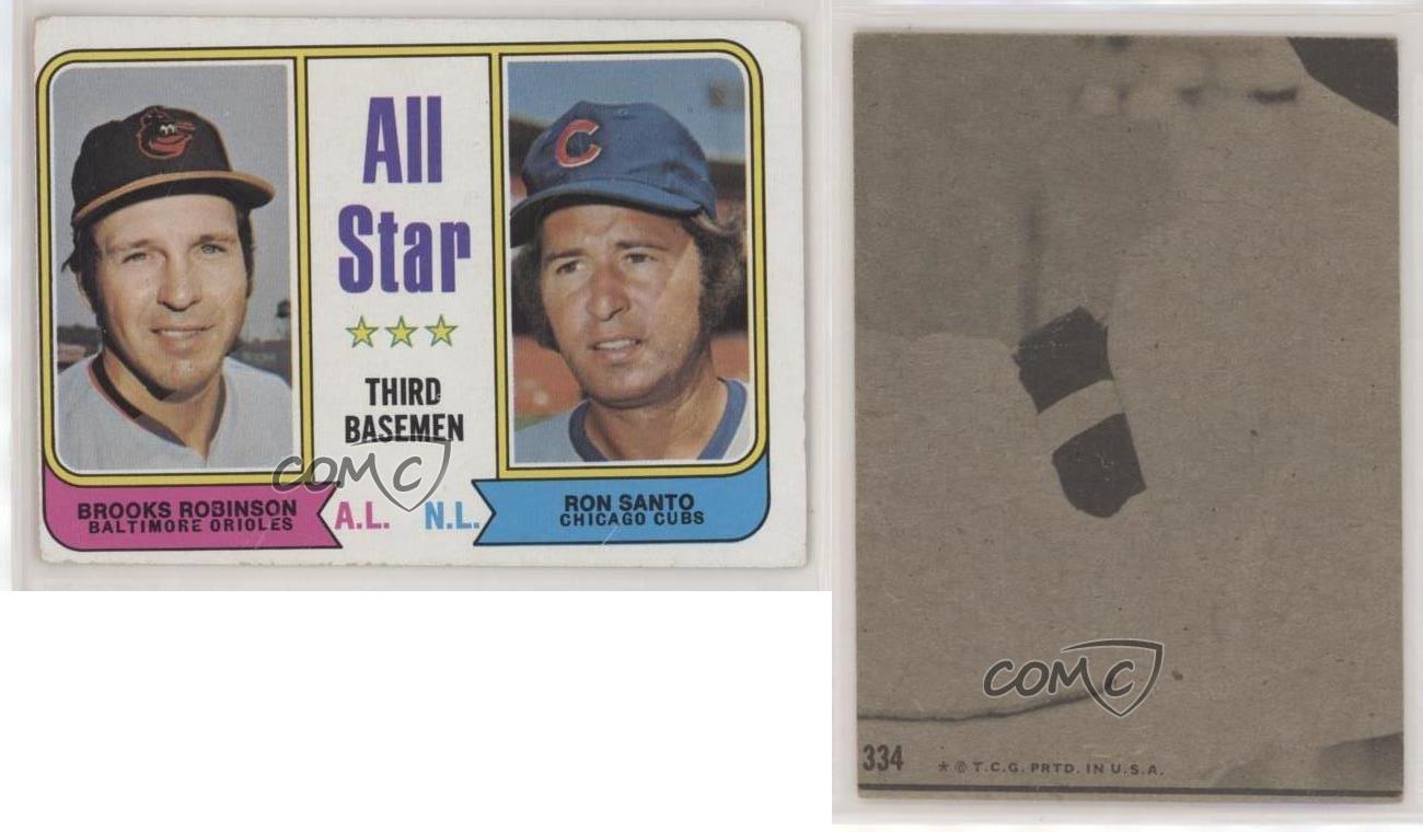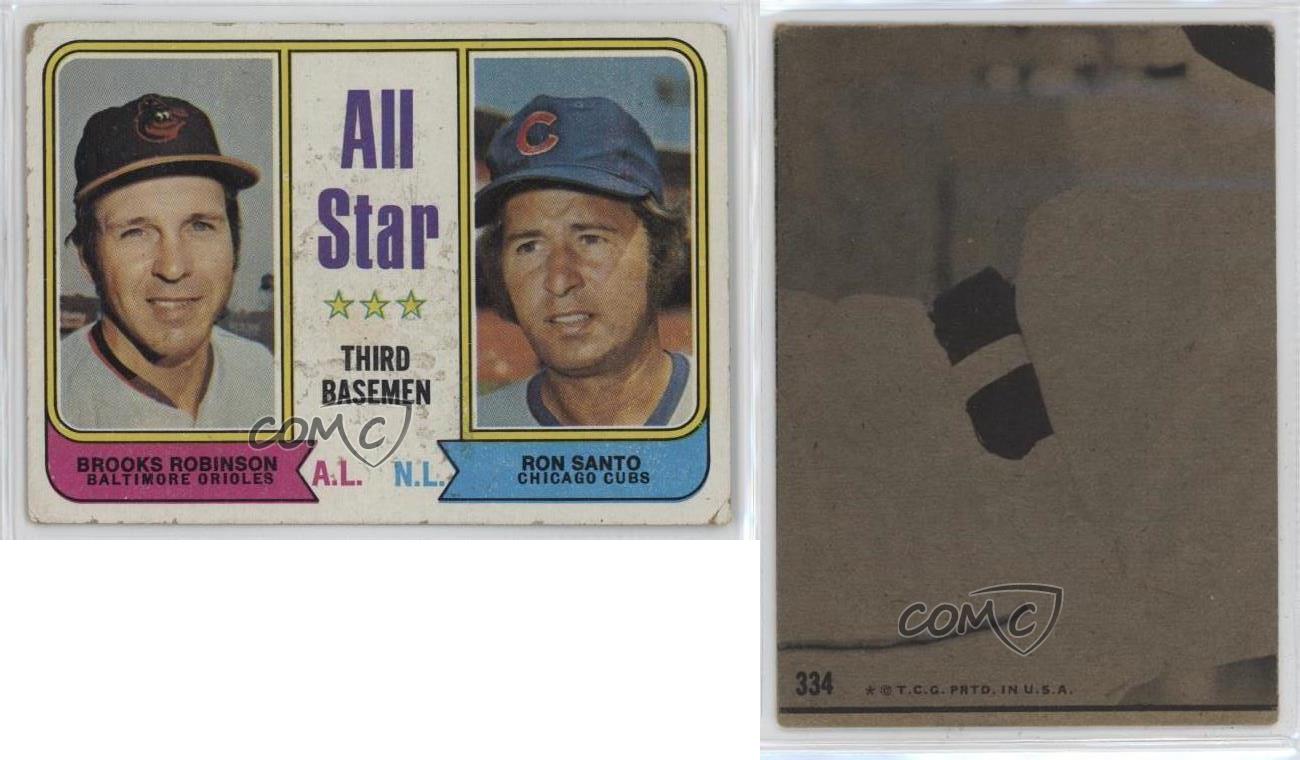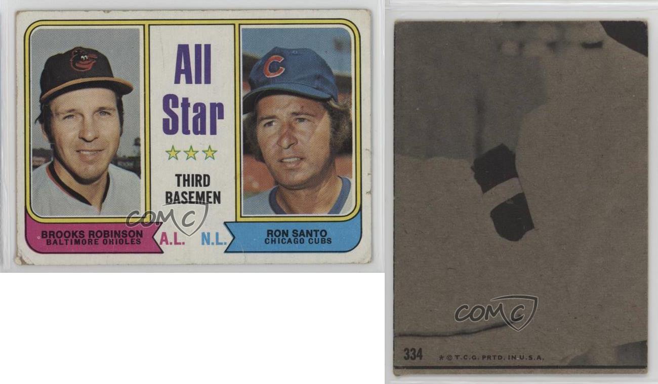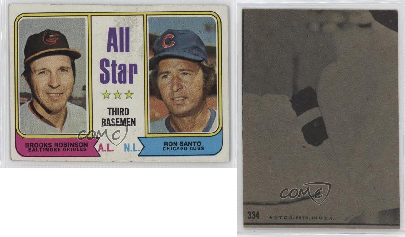 1974 Topps - [Base] #334 All Star Third Basemen - Brooks Robinson, Ron Santo - Baseball Card - Featuring the Baltimore Orioles and Chicago Cubs - Featuring Brooks Robinson and Ron Santo Search for more: 1974 Topps Search for more: 1974 Topps - [Base] View all of our Listings Auctions Buy It Now About Us Located in the beautiful Pacific Northwest, COMC (Check Out My Cards) is the world's largest consignment service for trading card singles. More than 10,000 people have used our consignment service to list over 50 million trading cards. Find out how we can help you consign your items on eBay by contacting us through eBay messaging. COMC -- "The Safe & Easy Way to Buy & Sell" Representative Image - Select Specific Item above to see image of actual item Representative Image - Select Specific Item above to see image of actual item Raw Condition for Modern Cards Unless otherwise noted, raw modern cards are listed in Near Mint-Mint condition or better. A NM-MT card appears to be Mint at first glance, but upon closer inspection, may exhibit some of the following: minor print defects (e.g. roller marks, print line, dimple), minor scratches, slight edge wear, and slight corner wear. Centering is clearly visible in the images provided and does not factor into our condition assessment. Raw Condition for Vintage Cards Unless otherwise noted, raw vintage cards are listed in Excellent condition or better. An EX card may exhibit some of the following: minor rounding of corners, surface wear, print defects, light scratches, and slight edge wear/chipping. Centering is clearly visible in the images provided and does not factor into our condition assessment. Domestic Shipping Combined shipping for multiple items is available. To receive combined shipping, please ensure all desired items are in your eBay shopping cart before proceeding to checkout. eBay limits orders to 40 items per order. We automatically combine multiple orders placed on the same day. If you place multiple orders on the same day, please contact us to request a refund of applicable shipping costs. Signature confirmation may be required on invoices over $400. All cards are protected and shipped securely. International Shipping COMC offers eBay's International Shipping (EIS) for international orders under $2,500* (see country exceptions below). All duties and import fees are paid at checkout; in the rare event that there are additional import fees upon delivery, these are borne by the buyer. EIS packages route through a shipping hub in Erlanger, KY before shipping to their final destination. Please note that EIS does not allow for combined shipments. The shipping rates are determined by eBay and cannot be adjusted. *Maximum sale price exceptions: Colombia, Kuwait ($2,000); Taiwan ($1,539); Chile, Costa Rica, Guatemala, Honduras, Trinidad and Tobago ($1,000); Antigua and Barbuda, Aruba, Belize, Dominica, Grenada, Philippines, Saint Kitts and Nevis, Saint Lucia, Montserrat, Turks and Caicos Islands ($500); Dominican Republic, El Salvador ($200). Please request a shipping quote through eBay messaging for orders that exceed the maximum sale price supported by eBay's International Shipping. You will be responsible for all duties and import fees for international orders shipped outside the EIS. All cards are protected and shipped securely. Payment COMC does not accept offers on our cards through our eBay storefront. COMC utilizes eBay’s managed payments system. If you are experiencing difficulties making a payment, please contact eBay for assistance. Return Policy Returns are only accepted on the rare occasion the item is not as described. If you are making a return, please initiate the return process through eBay so a mailing label can be provided for you. Prior to listing, our expert team carefully assessed this item to represent it accurately. Please review the description and high-definition images prior to purchasing to ensure this item meets your satisfaction. We welcome you to contact us if you have further questions about this item. Trust and Integrity COMC carefully assesses each item consigned to us to prevent fraudulent items from entering the marketplace. If you believe an item offered on COMC may be fraudulent, please contact us with details so we can investigate the issue. Items we determine are outside our supported items policy may be removed. Last Modified: 6/16/2025 6:07:05 AM PDT