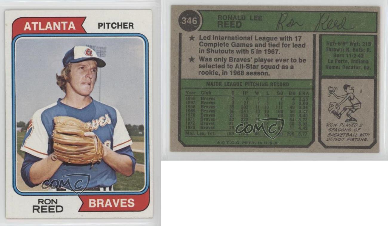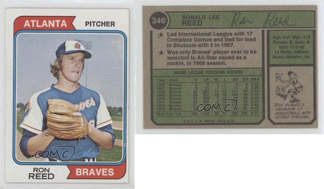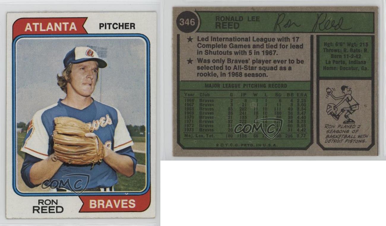 1974 Topps - [Base] #346 Ron Reed - Baseball Card - Featuring the Atlanta Braves - Featuring Ron Reed Search for more: 1974 Topps Search for more: 1974 Topps - [Base] View all of our Listings Auctions Buy It Now About Us Located in the beautiful Pacific Northwest, COMC (Check Out My Cards) is the world's largest consignment service for trading card singles. More than 10,000 people have used our consignment service to list over 50 million trading cards. Find out how we can help you consign your items on eBay by contacting us through eBay messaging. COMC -- "The Safe & Easy Way to Buy & Sell" Representative Image - Select Specific Item above to see image of actual item Representative Image - Select Specific Item above to see image of actual item Raw Condition for Modern Cards Unless otherwise noted, raw modern cards are listed in Near Mint-Mint condition or better. A NM-MT card appears to be Mint at first glance, but upon closer inspection, may exhibit some of the following: minor print defects (e.g. roller marks, print line, dimple), minor scratches, slight edge wear, and slight corner wear. Centering is clearly visible in the images provided and does not factor into our condition assessment. Raw Condition for Vintage Cards Unless otherwise noted, raw vintage cards are listed in Excellent condition or better. An EX card may exhibit some of the following: minor rounding of corners, surface wear, print defects, light scratches, and slight edge wear/chipping. Centering is clearly visible in the images provided and does not factor into our condition assessment. Domestic Shipping Combined shipping for multiple items is available. To receive combined shipping, please ensure all desired items are in your eBay shopping cart before proceeding to checkout. eBay limits orders to 40 items per order. We automatically combine multiple orders placed on the same day. If you place multiple orders on the same day, please contact us to request a refund of applicable shipping costs. Signature confirmation may be required on invoices over $400. All cards are protected and shipped securely. International Shipping COMC offers eBay's International Shipping (EIS) for international orders under $2,500* (see country exceptions below). All duties and import fees are paid at checkout; in the rare event that there are additional import fees upon delivery, these are borne by the buyer. EIS packages route through a shipping hub in Erlanger, KY before shipping to their final destination. Please note that EIS does not allow for combined shipments. The shipping rates are determined by eBay and cannot be adjusted. *Maximum sale price exceptions: Colombia, Kuwait ($2,000); Taiwan ($1,539); Chile, Costa Rica, Guatemala, Honduras, Trinidad and Tobago ($1,000); Antigua and Barbuda, Aruba, Belize, Dominica, Grenada, Philippines, Saint Kitts and Nevis, Saint Lucia, Montserrat, Turks and Caicos Islands ($500); Dominican Republic, El Salvador ($200). Please request a shipping quote through eBay messaging for orders that exceed the maximum sale price supported by eBay's International Shipping. You will be responsible for all duties and import fees for international orders shipped outside the EIS. All cards are protected and shipped securely. Payment COMC does not accept offers on our cards through our eBay storefront. COMC utilizes eBay’s managed payments system. If you are experiencing difficulties making a payment, please contact eBay for assistance. Return Policy Returns are only accepted on the rare occasion the item is not as described. If you are making a return, please initiate the return process through eBay so a mailing label can be provided for you. Prior to listing, our expert team carefully assessed this item to represent it accurately. Please review the description and high-definition images prior to purchasing to ensure this item meets your satisfaction. We welcome you to contact us if you have further questions about this item. Trust and Integrity COMC carefully assesses each item consigned to us to prevent fraudulent items from entering the marketplace. If you believe an item offered on COMC may be fraudulent, please contact us with details so we can investigate the issue. Items we determine are outside our supported items policy may be removed. Last Modified: 7/8/2025 4:23:09 PM PDT
