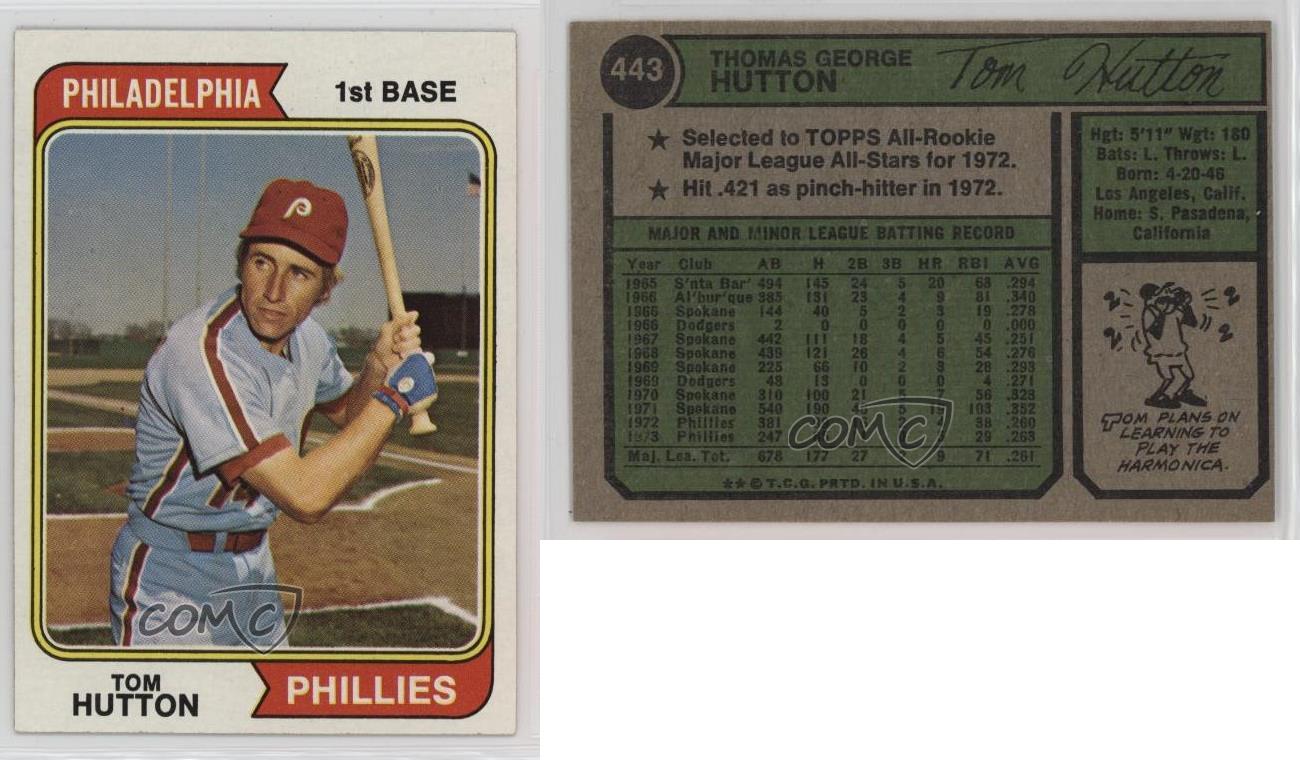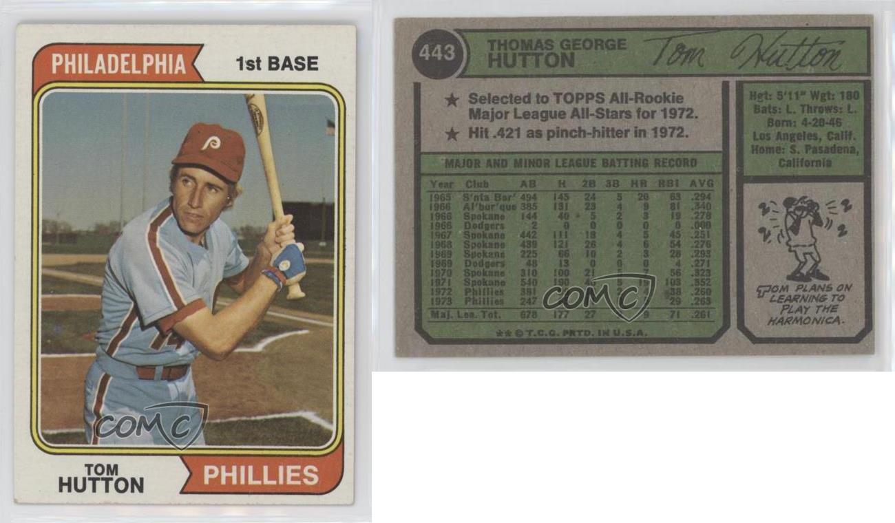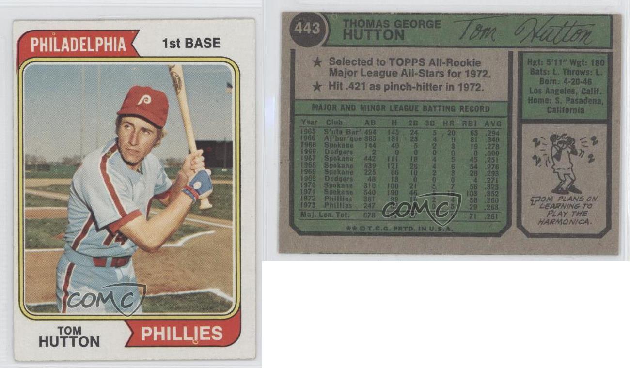 1974 Topps - [Base] #443 Tom Hutton - Baseball Card - Featuring the Philadelphia Phillies - Featuring Tom Hutton Search for more: 1974 Topps Search for more: 1974 Topps - [Base] View all of our Listings Auctions Buy It Now About Us Located in the beautiful Pacific Northwest, COMC (Check Out My Cards) is the world's largest consignment service for trading card singles. More than 10,000 people have used our consignment service to list over 50 million trading cards. Find out how we can help you consign your items on eBay by contacting us through eBay messaging. COMC -- "The Safe & Easy Way to Buy & Sell" Representative Image - Select Specific Item above to see image of actual item Representative Image - Select Specific Item above to see image of actual item Raw Condition for Modern Cards Unless otherwise noted, raw modern cards are listed in Near Mint-Mint condition or better. A NM-MT card appears to be Mint at first glance, but upon closer inspection, may exhibit some of the following: minor print defects (e.g. roller marks, print line, dimple), minor scratches, slight edge wear, and slight corner wear. Centering is clearly visible in the images provided and does not factor into our condition assessment. Raw Condition for Vintage Cards Unless otherwise noted, raw vintage cards are listed in Excellent condition or better. An EX card may exhibit some of the following: minor rounding of corners, surface wear, print defects, light scratches, and slight edge wear/chipping. Centering is clearly visible in the images provided and does not factor into our condition assessment. Domestic Shipping Combined shipping for multiple items is available. To receive combined shipping, please ensure all desired items are in your eBay shopping cart before proceeding to checkout. eBay limits orders to 40 items per order. We automatically combine multiple orders placed on the same day. If you place multiple orders on the same day, please contact us to request a refund of applicable shipping costs. Signature confirmation may be required on invoices over $400. All cards are protected and shipped securely. International Shipping COMC offers eBay's International Shipping (EIS) for international orders under $2,500* (see country exceptions below). All duties and import fees are paid at checkout; in the rare event that there are additional import fees upon delivery, these are borne by the buyer. EIS packages route through a shipping hub in Erlanger, KY before shipping to their final destination. Please note that EIS does not allow for combined shipments. The shipping rates are determined by eBay and cannot be adjusted. *Maximum sale price exceptions: Colombia, Kuwait ($2,000); Taiwan ($1,539); Chile, Costa Rica, Guatemala, Honduras, Trinidad and Tobago ($1,000); Antigua and Barbuda, Aruba, Belize, Dominica, Grenada, Philippines, Saint Kitts and Nevis, Saint Lucia, Montserrat, Turks and Caicos Islands ($500); Dominican Republic, El Salvador ($200). Please request a shipping quote through eBay messaging for orders that exceed the maximum sale price supported by eBay's International Shipping. You will be responsible for all duties and import fees for international orders shipped outside the EIS. All cards are protected and shipped securely. Payment COMC does not accept offers on our cards through our eBay storefront. COMC utilizes eBay’s managed payments system. If you are experiencing difficulties making a payment, please contact eBay for assistance. Return Policy Returns are only accepted on the rare occasion the item is not as described. If you are making a return, please initiate the return process through eBay so a mailing label can be provided for you. Prior to listing, our expert team carefully assessed this item to represent it accurately. Please review the description and high-definition images prior to purchasing to ensure this item meets your satisfaction. We welcome you to contact us if you have further questions about this item. Trust and Integrity COMC carefully assesses each item consigned to us to prevent fraudulent items from entering the marketplace. If you believe an item offered on COMC may be fraudulent, please contact us with details so we can investigate the issue. Items we determine are outside our supported items policy may be removed. Last Modified: 7/5/2025 6:41:20 PM PDT