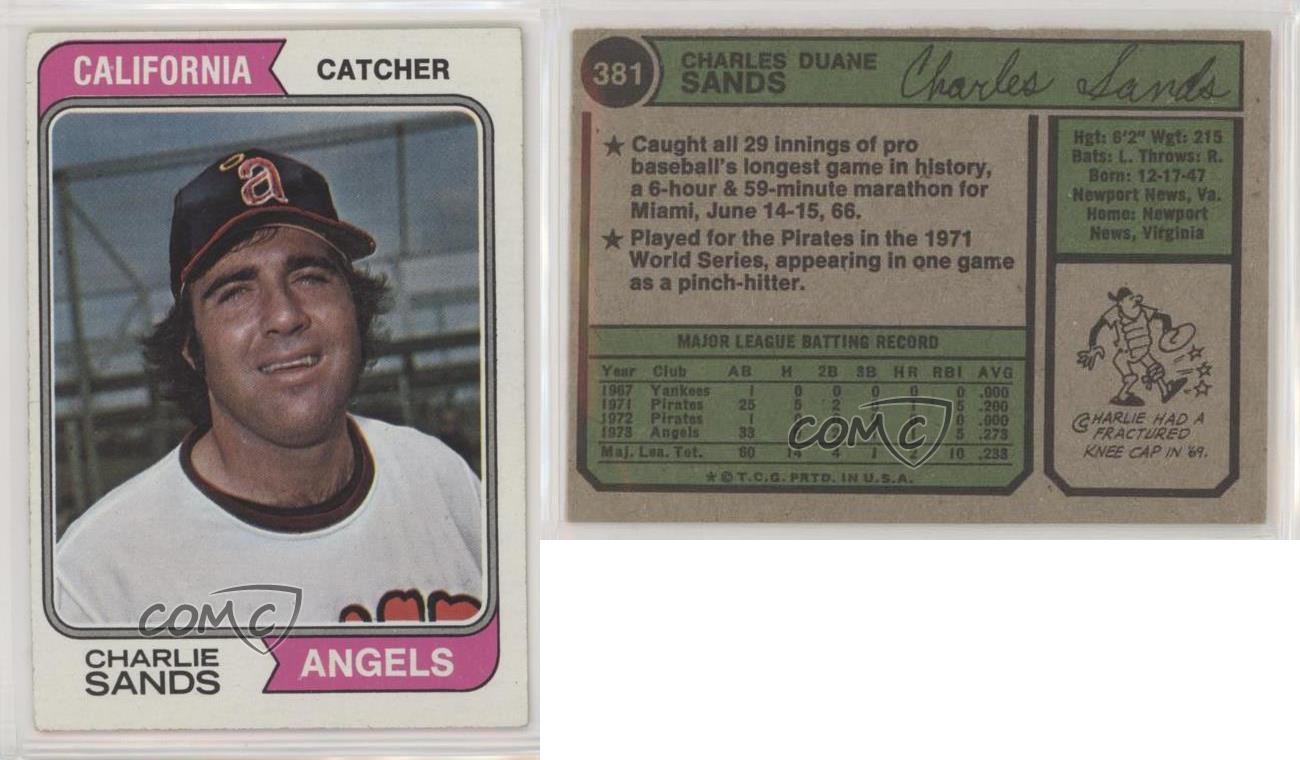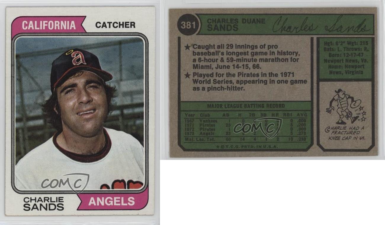 1974 Topps - [Base] #381 Charlie Sands - Baseball Card - Featuring the Los Angeles Angels - Featuring Charlie Sands Search for more: 1974 Topps Search for more: 1974 Topps - [Base] View all of our Listings Auctions Buy It Now About Us Located in the beautiful Pacific Northwest, COMC (Check Out My Cards) is the world's largest consignment service for trading card singles. More than 10,000 people have used our consignment service to list over 50 million trading cards. Find out how we can help you consign your items on eBay by contacting us through eBay messaging. COMC -- "The Safe & Easy Way to Buy & Sell" Representative Image - Select Specific Item above to see image of actual item Representative Image - Select Specific Item above to see image of actual item Raw Condition for Modern Cards Unless otherwise noted, raw modern cards are listed in Near Mint-Mint condition or better. A NM-MT card appears to be Mint at first glance, but upon closer inspection, may exhibit some of the following: minor print defects (e.g. roller marks, print line, dimple), minor scratches, slight edge wear, and slight corner wear. Centering is clearly visible in the images provided and does not factor into our condition assessment. Raw Condition for Vintage Cards Unless otherwise noted, raw vintage cards are listed in Excellent condition or better. An EX card may exhibit some of the following: minor rounding of corners, surface wear, print defects, light scratches, and slight edge wear/chipping. Centering is clearly visible in the images provided and does not factor into our condition assessment. Domestic Shipping Combined shipping for multiple items is available. To receive combined shipping, please ensure all desired items are in your eBay shopping cart before proceeding to checkout. eBay limits orders to 40 items per order. We automatically combine multiple orders placed on the same day. If you place multiple orders on the same day, please contact us to request a refund of applicable shipping costs. Signature confirmation may be required on invoices over $400. All cards are protected and shipped securely. International Shipping COMC offers eBay's International Shipping (EIS) for international orders under $2,500* (see country exceptions below). All duties and import fees are paid at checkout; in the rare event that there are additional import fees upon delivery, these are borne by the buyer. EIS packages route through a shipping hub in Erlanger, KY before shipping to their final destination. Please note that EIS does not allow for combined shipments. The shipping rates are determined by eBay and cannot be adjusted. *Maximum sale price exceptions: Colombia, Kuwait ($2,000); Taiwan ($1,539); Chile, Costa Rica, Guatemala, Honduras, Trinidad and Tobago ($1,000); Antigua and Barbuda, Aruba, Belize, Dominica, Grenada, Philippines, Saint Kitts and Nevis, Saint Lucia, Montserrat, Turks and Caicos Islands ($500); Dominican Republic, El Salvador ($200). Please request a shipping quote through eBay messaging for orders that exceed the maximum sale price supported by eBay's International Shipping. You will be responsible for all duties and import fees for international orders shipped outside the EIS. All cards are protected and shipped securely. Payment COMC does not accept offers on our cards through our eBay storefront. COMC utilizes eBay’s managed payments system. If you are experiencing difficulties making a payment, please contact eBay for assistance. Return Policy Returns are only accepted on the rare occasion the item is not as described. If you are making a return, please initiate the return process through eBay so a mailing label can be provided for you. Prior to listing, our expert team carefully assessed this item to represent it accurately. Please review the description and high-definition images prior to purchasing to ensure this item meets your satisfaction. We welcome you to contact us if you have further questions about this item. Trust and Integrity COMC carefully assesses each item consigned to us to prevent fraudulent items from entering the marketplace. If you believe an item offered on COMC may be fraudulent, please contact us with details so we can investigate the issue. Items we determine are outside our supported items policy may be removed. Last Modified: 7/8/2025 4:31:34 PM PDT