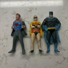 The product is a rare set of 4" vintage action figures depicting Batman, Robin, Superman (Clark Kent), and other characters from DC Comics. Manufactured in Hong Kong in 1974, these PVC figures are collectible items for fans of classic Batman and Superman comics. With their nostalgic appeal and historical significance, these action figures are a sought-after addition to any comic book or pop culture memorabilia collection. Cosmetic scratches and worn paint spots. Selling as is!