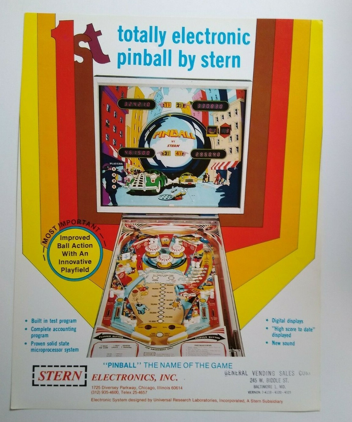 Stern Pinball FLYER 1977 Original Flipper Game Artwork Sheet Solid State Version Original paper promo sales flyer. Single page one sided artwork sheet. Has dealer stamp and light wrinkles. See photos. This is the flyer for the 1st Stern pinball machine produced! Flyers are paper promotional advertising sheets made for coin operated amusement arcade games. Also called a circular, brochure, pamphlet, or flier. All are single sheets unless noted otherwise. If there is artwork on the back side it will be shown. Size is 8.5" X 11". Perfect for framing. Makes great wall art for the man cave or a unique gift idea. Sheet protector included with each flyer sold. Orders are shipped with care. More pinball, jukebox, slot machine, and arcade game items for sale in our store. SHIPPING Bundle and save by using cart and making single payment. International buyers are responsible for any import fees/taxes. ABOUT US Seller of vintage collectibles, gifts, advertising, artwork, original pinball flyers, vinyl records, video arcade flyers, pinball machine translites, game manuals, score cards, magazines, antique Halloween and holiday postcards, Christmas items, super hero memorabilia, horror themed art.