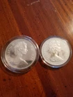 This set of two silver proof coins from Fiji features the portrait of Queen Elizabeth II on one side and a traditional Fijian design on the other. Minted in 1978, this (2) coin set has a denomination of $10 and $20, respectively. Both coins are made of 0.925 fine silver and come from Fiji, a country in the Pacific Ocean. The set is uncertified and is in uncirculated condition with proof strike. 1978 $10 Coin: 0.925 fineness, 0.841 troy oz silver 1978 $20 Coin: 0.925 fineness, 1.685 troy oz silver Total Silver content: 2.526 troy oz The coins are in overall great addition, but they do contain noticeable imperfections. There are fingerprints/dirt marks on both coins, as well as some scratches. Please view all pictures and be aware of condition flaws. Send me any questions you may have and I'll get back to you ASAP!