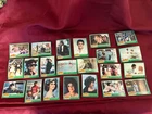 The product is a set of 1978 Topps Grease Movie Trading Cards featuring characters and scenes from the popular movie "Grease." This lot includes 22 cards from Series 2 in a green parallel/variety, with notable cast members such as John Travolta, Olivia Newton John, Stockard Channing, and more. These non-sport trading cards are made of card stock and are considered a first edition collectible item, ideal for fans of the music and romance genres depicted in the film. Each card is in standard size and offers a nostalgic look back at the iconic movie. Card#'s 132,131,130,129,128,127,126,125,124,122,121,120,119,117,115,114,113,112,111,110,109, and 108.