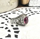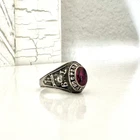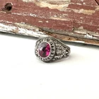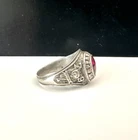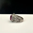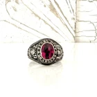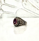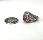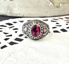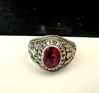 Vintage Pearl City Chargers 1979 class ring. Unkown metal content. I assume the ring silver tone metal. A pre-owned signet class ring. The face is 13mm top to bottom (1/2") and the ring fits a size 6 1/2 on our jeweler's ring mandrel. The ring is unsigned for metal content. The band weighs 5.5 grams on our electronic scale. This piece is in good used/pre-owned condition, it does show some signs of previous use including some very very small scuffs to the metal; it needs to be cleaned and polished though we have not, it is NOT NEW. The band measures 3mm top to bottom. This ring currently fits a size 6 1/2 on our jeweler's ring mandrel.