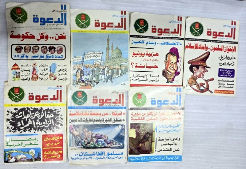 1979-80 Lot 7 Arabic Muslim Brotherhood Magazine مجلة الدعوة الاخوان المسلمين 1979 No. 43 1980 No. 51-56 1981 No. 58-59-62-63 Type: Original. Not a re-print Rare magazine Printed in Egypt Condition: In excellent condition , Complete. Size :24 x32 cm لقد أرسلت 11 أبريل الساعة 11:35 م Size: 28x 20cm. Number of pages : 129 Pag