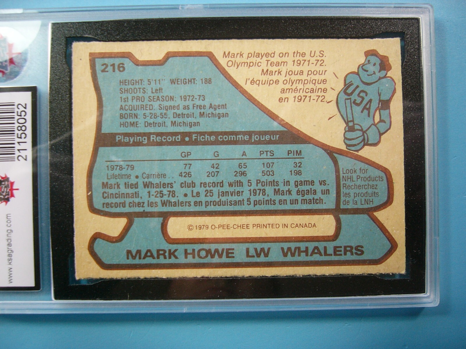 YOU ARE BIDDING ON A 1979/80 O-PEE-CHEE NHL HOCKEY CARD #216 MARK HOWE, HARTFORD WHALERS. CARD IS GRADED 10 BY KSA IN GEM MINT CONDITION. SEE SCANS FOR FURTHER CONDITION. GREAT COLOUR & GLOSS--A SUPER SHARP, CLEAN & ATTRACTIVE IMPORTANT & VERY POPULAR CARD FROM THIS VALUABLE O-PEE-CHEE HOCKEY SET!!! THANKS FOR LOOKING!!! -------------------------------------------------------------------------------------------------------------------------------- SHIPPING WITH TRACKING AND INSURANCE WITHIN CANADA IS $12.50, TO THE UNITED STATES $15.00 AND INTERNATIONALLY $55.00 (EVERYWHERE ELSE). ITEM WILL BE CAREFULLY PACKAGED SO AS NOT TO GET DAMAGED DURING SHIPPING. WE DO COMBINE SHIPPING ON MULTIPLE PURCHASES--ONLY 50 CENTS PER ADDITIONAL GRADED CARD OR ONLY 20 CENTS MORE PER ADDITIONAL SINGLE UNGRADED PHOTO OR CARD. TAKE A LOOK AT OUR OTHER AUCTIONS AND SAVE ON SHIPPING!!!