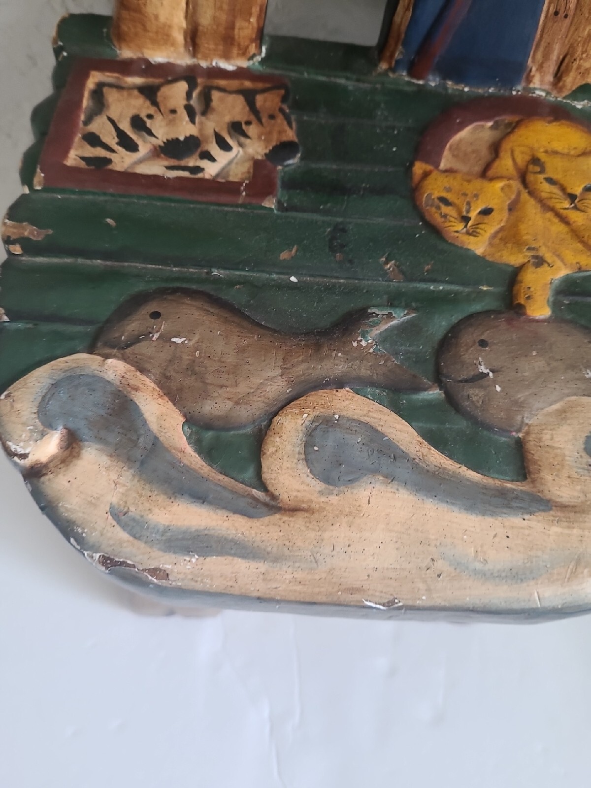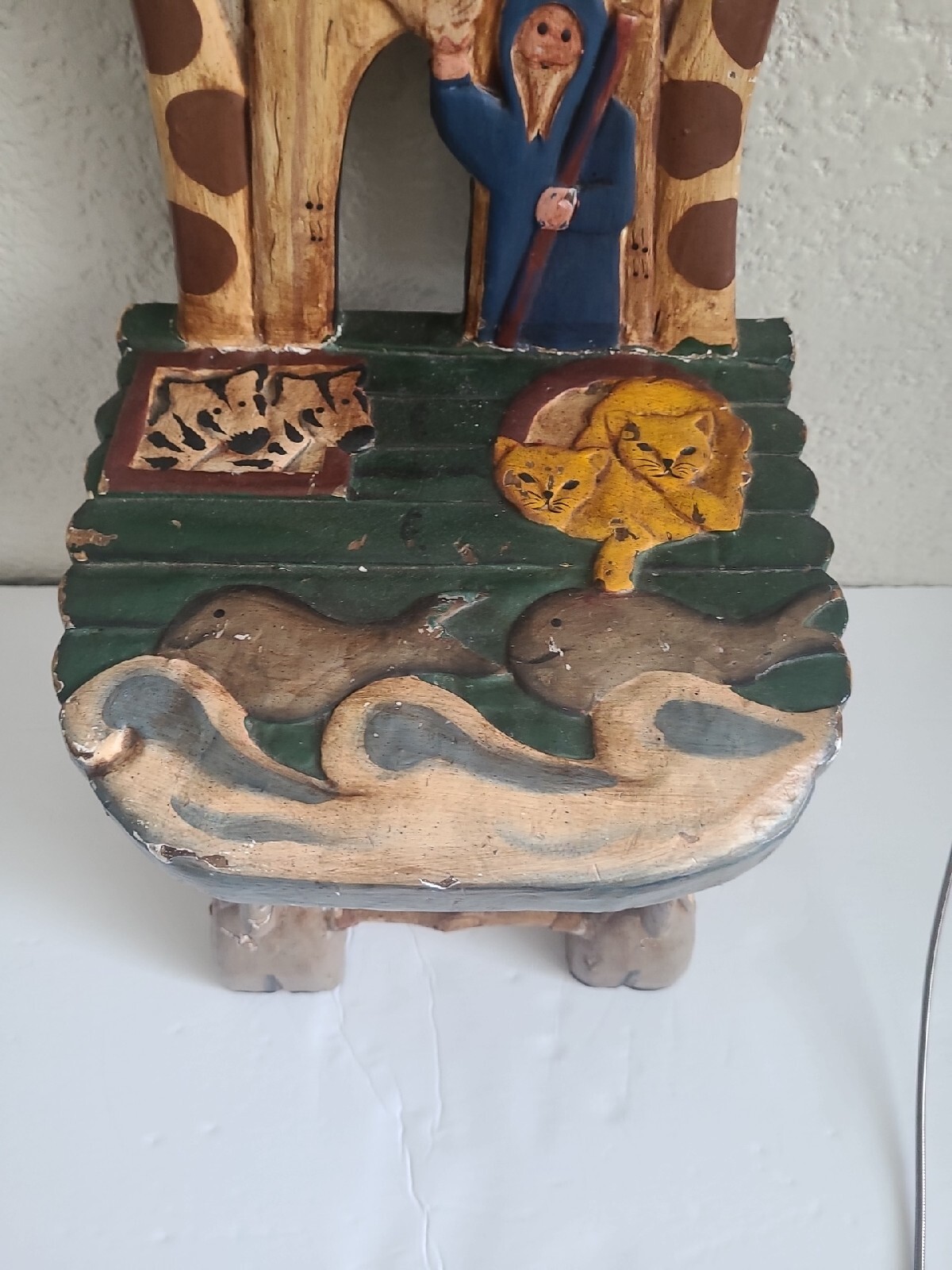 This beautiful child's chair is a unique piece of furniture that will add charm and character to any room. Crafted in the 1980s, this chair features intricate carvings of animals from Noah's Ark and is painted with a vibrant, multicolor finish. The chair is made with a sturdy construction and stands at 17.5 inches tall, 10 inches long, and 9 inches wide. This antique chair is perfect for any collector or enthusiast of vintage furniture. It is ideal for a child's room or as a decorative piece in a living room or study. The chair's brand is unbranded and it has several features, including carvings and a painted finish. Don't miss out on the opportunity to own this one-of-a-kind piece!