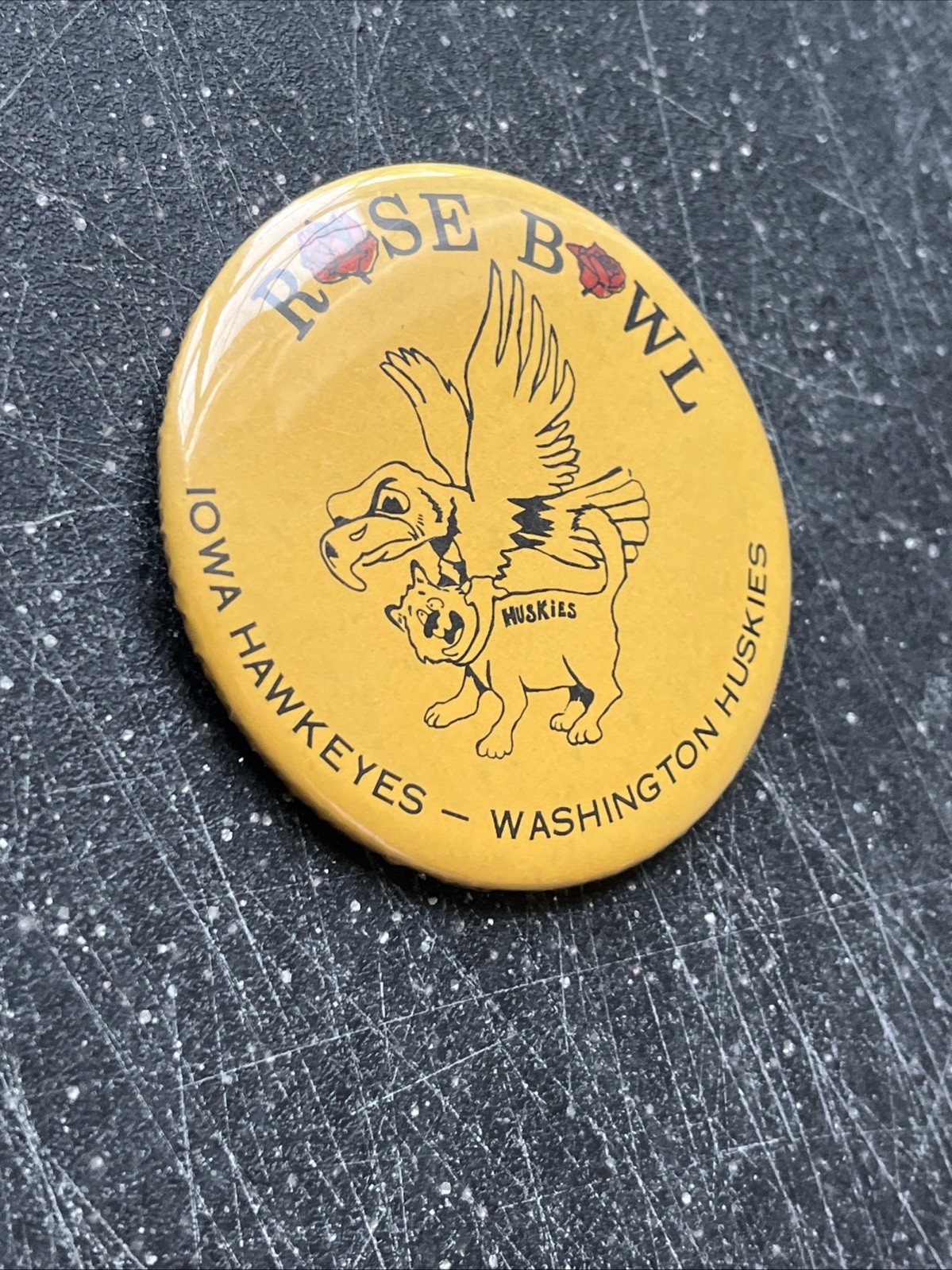 The product is an officially licensed Iowa Hawkeyes 1981 Rose Bowl button featuring the team's logo and colors. This collectible item commemorates the football team's participation in the bowl game against the Washington Huskies. Made in the United States, this unisex adult pin is a perfect addition to any fan's sports memorabilia collection. This was a button that I got when I was a kid in the early 80s. The pin or button is in really good shape. Please reach out if you have any questions on this item.