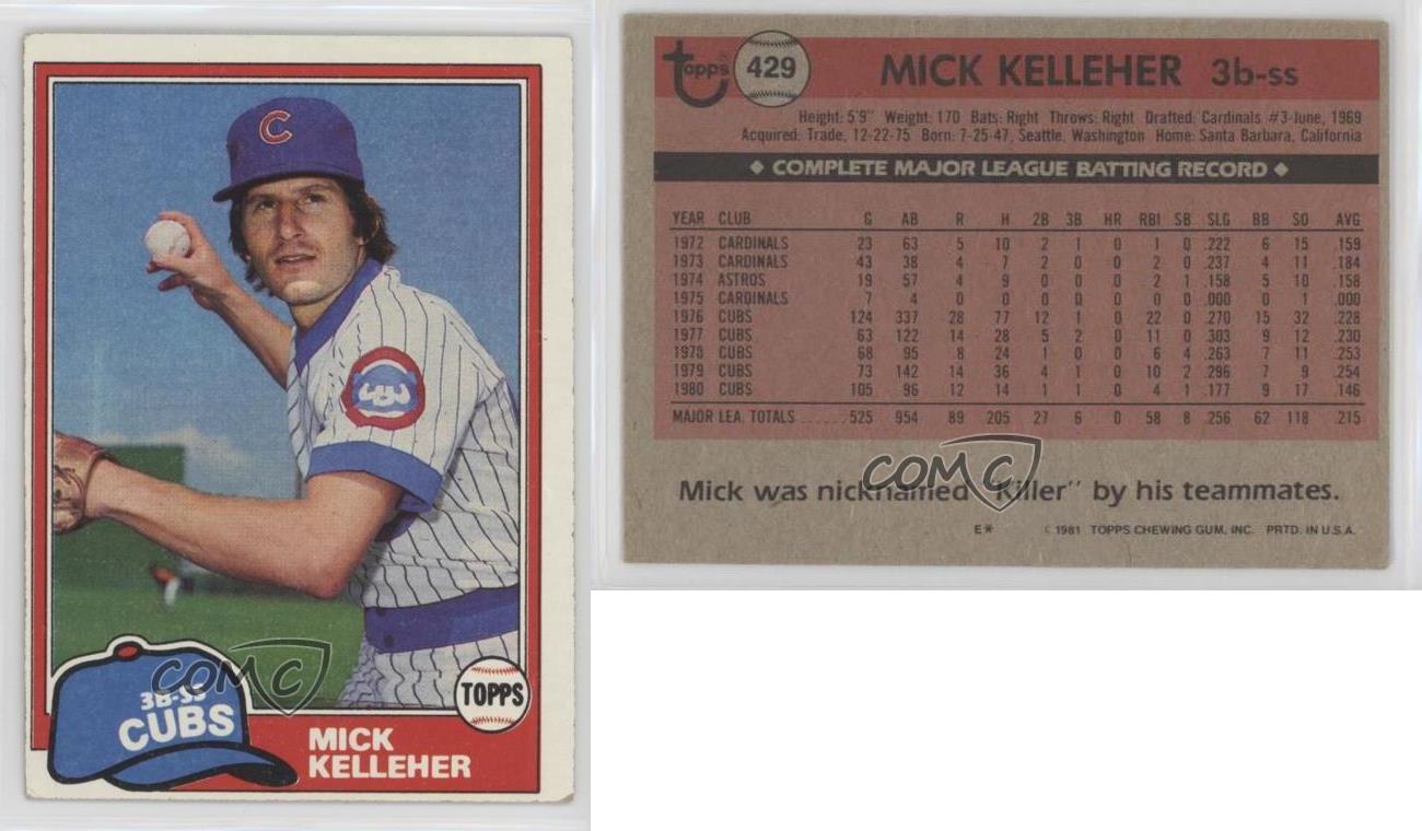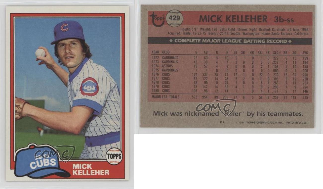1981 Topps - [Base] #429 Mick Kelleher - Baseball Card - Featuring the Chicago Cubs - Featuring Mick Kelleher Search for more: 1981 Topps Search for more: 1981 Topps - [Base] View all of our Listings Auctions Buy It Now About Us Located in the beautiful Pacific Northwest, COMC (Check Out My Cards) is the world's largest consignment service for trading card singles. More than 10,000 people have used our consignment service to list over 50 million trading cards. Find out how we can help you consign your items on eBay by contacting us through eBay messaging. COMC -- "The Safe & Easy Way to Buy & Sell" Representative Image - Select Specific Item above to see image of actual item Representative Image - Select Specific Item above to see image of actual item Raw Condition for Modern Cards Unless otherwise noted, raw modern cards are listed in Near Mint-Mint condition or better. A NM-MT card appears to be Mint at first glance, but upon closer inspection, may exhibit some of the following: minor print defects (e.g. roller marks, print line, dimple), minor scratches, slight edge wear, and slight corner wear. Centering is clearly visible in the images provided and does not factor into our condition assessment. Raw Condition for Vintage Cards Unless otherwise noted, raw vintage cards are listed in Excellent condition or better. An EX card may exhibit some of the following: minor rounding of corners, surface wear, print defects, light scratches, and slight edge wear/chipping. Centering is clearly visible in the images provided and does not factor into our condition assessment. Domestic Shipping Combined shipping for multiple items is available. To receive combined shipping, please ensure all desired items are in your eBay shopping cart before proceeding to checkout. eBay limits orders to 40 items per order. We automatically combine multiple orders placed on the same day. If you place multiple orders on the same day, please contact us to request a refund of applicable shipping costs. Signature confirmation may be required on invoices over $400. All cards are protected and shipped securely. International Shipping COMC offers eBay's International Shipping (EIS) for international orders under $2,500* (see country exceptions below). All duties and import fees are paid at checkout; in the rare event that there are additional import fees upon delivery, these are borne by the buyer. EIS packages route through a shipping hub in Erlanger, KY before shipping to their final destination. Please note that EIS does not allow for combined shipments. The shipping rates are determined by eBay and cannot be adjusted. *Maximum sale price exceptions: Colombia, Kuwait ($2,000); Taiwan ($1,539); Chile, Costa Rica, Guatemala, Honduras, Trinidad and Tobago ($1,000); Antigua and Barbuda, Aruba, Belize, Dominica, Grenada, Philippines, Saint Kitts and Nevis, Saint Lucia, Montserrat, Turks and Caicos Islands ($500); Dominican Republic, El Salvador ($200). Please request a shipping quote through eBay messaging for orders that exceed the maximum sale price supported by eBay's International Shipping. You will be responsible for all duties and import fees for international orders shipped outside the EIS. All cards are protected and shipped securely. Payment COMC does not accept offers on our cards through our eBay storefront. COMC utilizes eBay’s managed payments system. If you are experiencing difficulties making a payment, please contact eBay for assistance. Return Policy Returns are only accepted on the rare occasion the item is not as described. If you are making a return, please initiate the return process through eBay so a mailing label can be provided for you. Prior to listing, our expert team carefully assessed this item to represent it accurately. Please review the description and high-definition images prior to purchasing to ensure this item meets your satisfaction. We welcome you to contact us if you have further questions about this item. Trust and Integrity COMC carefully assesses each item consigned to us to prevent fraudulent items from entering the marketplace. If you believe an item offered on COMC may be fraudulent, please contact us with details so we can investigate the issue. Items we determine are outside our supported items policy may be removed. Last Modified: 6/7/2025 9:04:50 PM PDT
