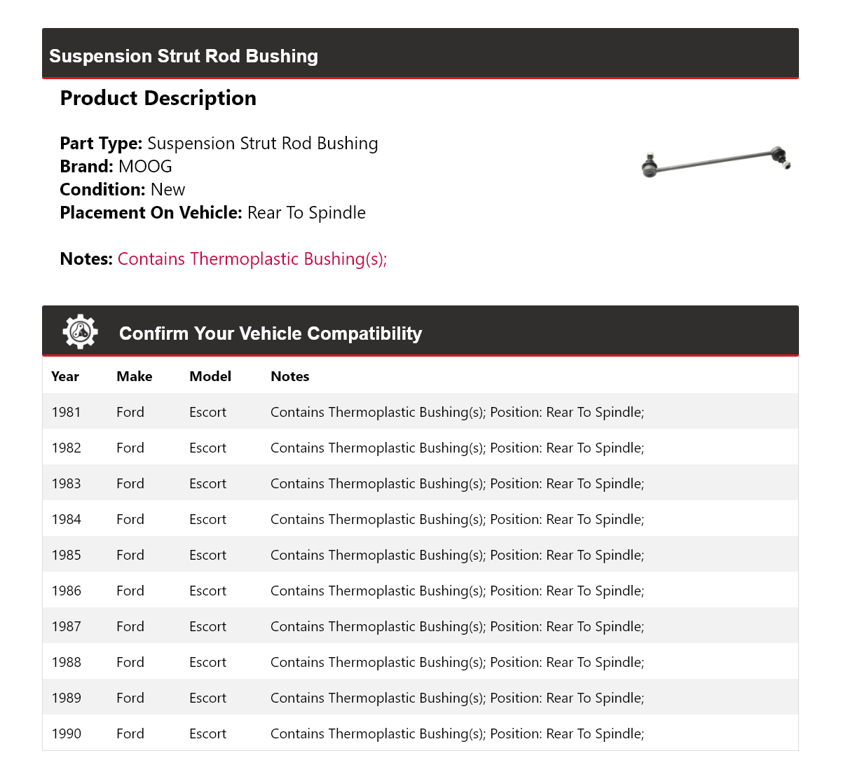 Document For 1981-1990 Ford Escort Suspension Strut Rod Bushing Rear To Spindle MOOG Notes: Contains Thermoplastic Bushing(s); Placement on Vehicle: Rear To Spindle Product Description Description Brand: MOOG Warranty: 12 Month Warranty Part Type: Suspension Strut Rod Bushing Compatible Years: 1981 1982 1983 1984 1985 1986 1987 1988 1989 1990 Description Strut Rod Bushing Suspension Strut Rod Bushing Easy to install. Restores like-new steering and handling. Engineered to meet or exceed OE requirements. Construction and design validated by MOOG engineers. Incorporates proven design and engineering features. Item Specifics Inside Diameter: 0.670 IN Outside Diameter: 1.600 IN Length: 1.250 IN Material: Polyurethane Meets/Exceeds OE Manufacturer Specs: Yes Confirm Your Vehicle Compatibility Year Make Model Notes 1981 Ford Escort Contains Thermoplastic Bushing(s)| Position: Rear To Spindle; 1982 Ford Escort Contains Thermoplastic Bushing(s)| Position: Rear To Spindle; 1983 Ford Escort Contains Thermoplastic Bushing(s)| Position: Rear To Spindle; 1984 Ford Escort Contains Thermoplastic Bushing(s)| Position: Rear To Spindle; 1985 Ford Escort Contains Thermoplastic Bushing(s)| Position: Rear To Spindle; 1986 Ford Escort Contains Thermoplastic Bushing(s)| Position: Rear To Spindle; 1987 Ford Escort Contains Thermoplastic Bushing(s)| Position: Rear To Spindle; 1988 Ford Escort Contains Thermoplastic Bushing(s)| Position: Rear To Spindle; 1989 Ford Escort Contains Thermoplastic Bushing(s)| Position: Rear To Spindle; 1990 Ford Escort Contains Thermoplastic Bushing(s)| Position: Rear To Spindle; Please read before purchasing Shipping and Cancellation Policy We utilize UPS, FedEx, and USPS for shipping, selecting the nearest available location to expedite delivery. Tracking numbers will be uploaded on eBay upon shipment. Most items are shipped on the same business day. Please note that interchange tables are intended for American Market Vehicles only. All orders are processed automatically. Before placing your order, please: Ensure that this part fits your vehicle by entering your vehicle's Year, Make, Model, Trim, and Engine in the Compatibility Table. Additionally, review the notes section in the compatibility chart for additional specifications about this part. If you're still unsure whether the part fits your car, please contact us for assistance. Verify that the item you're about to purchase will solve the problem with your car. Double-check that the delivery address provided during checkout is accurate. Return Policy We offer free returns for domestic purchases. However, please note that we are not responsible for the cost of international return shipping. Before returning items or leaving anything other than positive feedback, please contact us. For further details regarding returns, please refer to the "Shipping and Payments" tab. Additionally, it is important to understand that manufacturers reserve the right to modify the appearance or material of their items. They may even discontinue an item and replace it with an updated version. Consequently, the picture displayed may not always reflect the most recent changes, though this occurs rarely. We source our pictures directly from the manufacturer and may not immediately receive updated photos if changes are made. California Proposition 65 WARNING: This product may contain chemicals known to the State of California to cause cancer and birth defects or other reproductive harm. For more info go to www.p65warnings.ca.gov 2024 DTautoparts All Rights Reserved