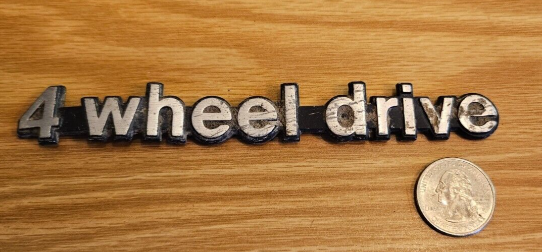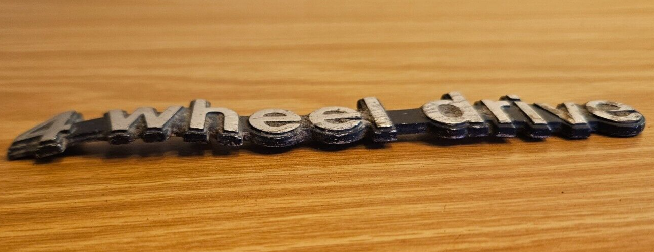 This is a vintage metal emblem designed for the Jeep Wagoneer from 1982-1986. The emblem features the text "4 Wheel Drive" and is suitable for placement on the rear quarter panel of the vehicle. It has a silver on black color scheme and attaches using adhesive. The emblem signifies the vehicle's 4 wheel drive capability and adds a vintage touch to the Jeep Wagoneer. 1982-1986 Jeep Wagoneer Metal "4 Wheel Drive" Rear Quarter Panel Emblem. Not in great condition as the entire emblem is shaped like a lasagna noodle (its bent). It is also scratched and pretty dirty. Price reflects this damage. Best suited to be a decoration piece, unless you are looking for a cheap metal emblem for a s&^!-box. See photos for more details! Any questions? Feel free to ask! Location - BB