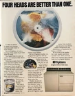 The product is a vintage 1983 Frigidaire Washer magazine print ad featuring the Halo Spray Fill System with four heads. The ad showcases the appliance in a multi-color design and promotes its features. It was created in the United States and measures approximately 10"x12". The ad highlights the innovative technology of the washer and is a collectible piece from the 1980s.