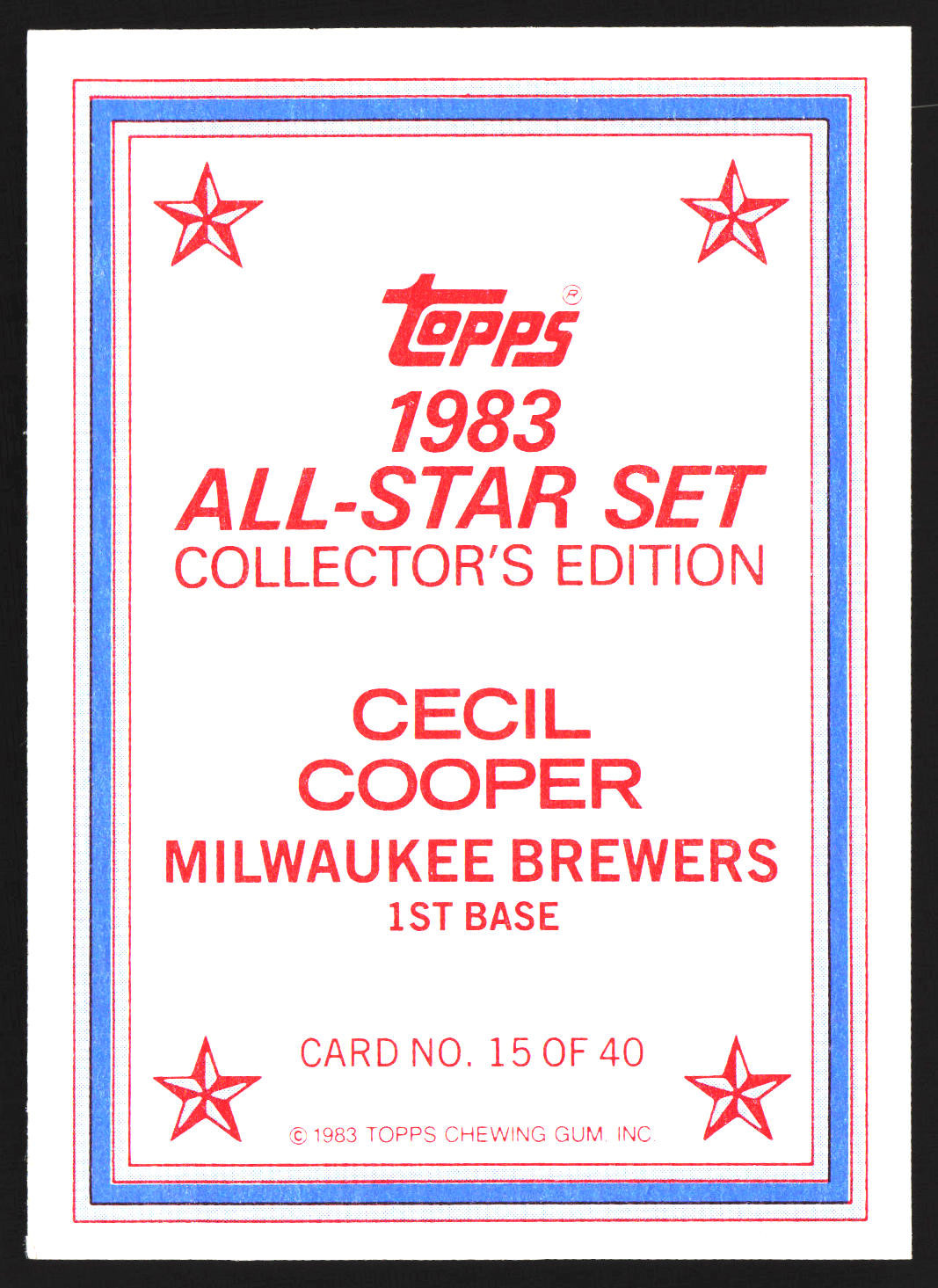 The Card pictured is the card you will receive unless there are multiple quantities then you will receive a card in the comparable grade. Cards in poor condition could have creasing, stains, rounded corners, pen marks or a combo of them. please see pics for a better understanding of cards condition. Very Good Milwaukee Brewers 1983 All-Star Set Collector's Edition (Glossy Send-Ins) Cecil Cooper #15 1983 Topps Topps 1983 Baseball .