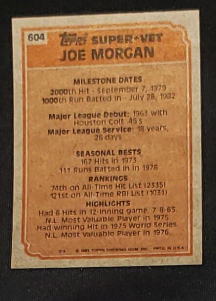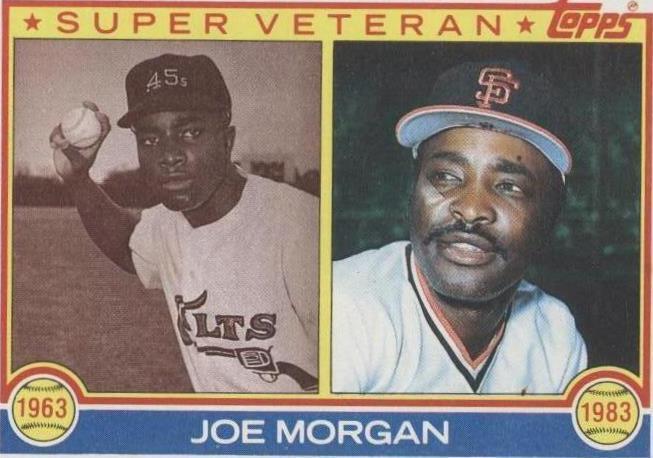 Set:1983 ToppsAdditional Description:Super Veteran - Joe MorganPlayer/Athlete:Joe MorganSeason:1983Sport:BaseballSubset:Super VeteranParallel/Variety:[Base]League:Major League Baseball (MLB)brand:ToppsFeatures:Base SetCard Number:604Team:Houston Colt .45s, San Francisco GiantsManufacturer:ToppsSeries:Topps