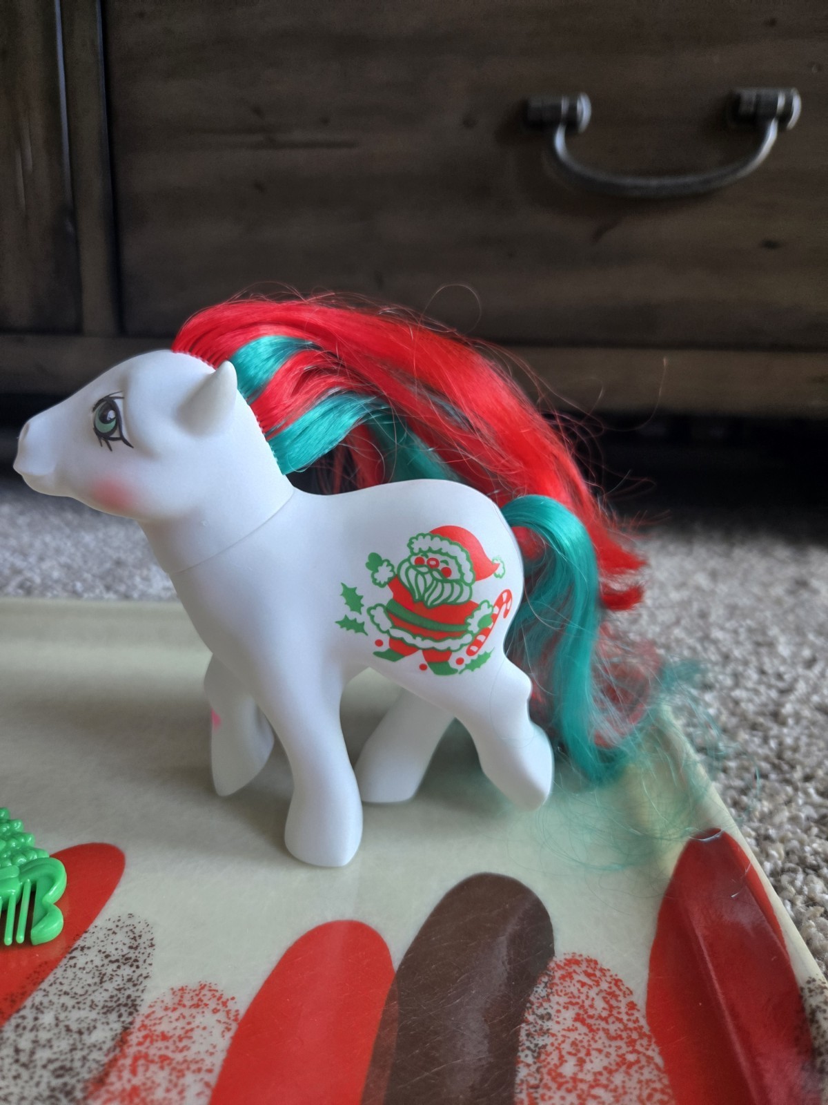 This vintage 1984 My Little Pony Merry Treats Christmas Horse toy is a collectible action figure featuring the beloved character from the My Little Pony franchise. Made of plastic, this white horse comes with a green tree comb included, adding an extra element to playtime. With its nostalgic charm and original Hasbro brand, this toy is sure to delight fans of My Little Pony and collectors of vintage toys from the 1980s. Perfect for reliving childhood memories or adding to a collection, this Merry Treats horse is a festive and fun addition to any toy collection. does have small amount of pink marker on front right leg.