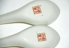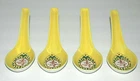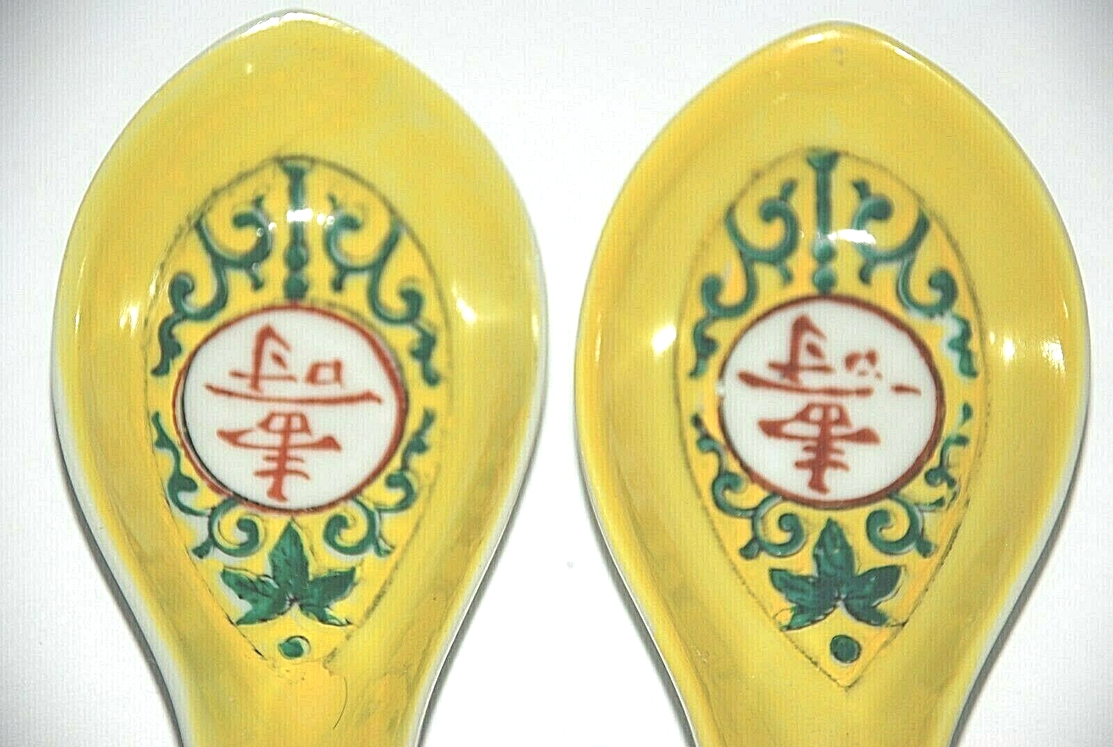 Vintage 1985 Japanese Chinese Soup Rice Spoons Asian Yellow Porcelain Egg Drop Set of 4 . They each measure 5.50" long. There are Chinese characters inside the spoon and the backside . Since I don't read asian characters I don't know what it says. All four spoons are in beautiful pre owned condition with no chips or cracks. They are very clean. They have not been used since the 1980's.
