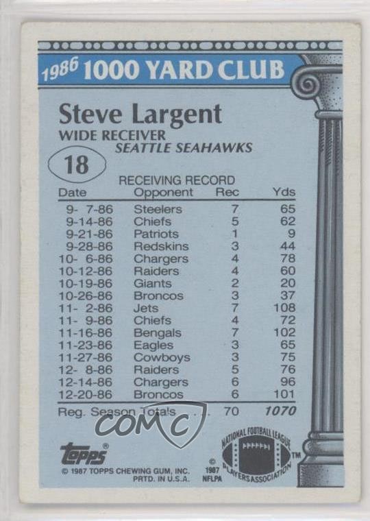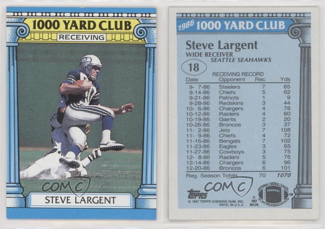 1987 Topps - 1000 Yard Club #18 Steve Largent - Football Card - Featuring the Seattle Seahawks - Featuring Steve Largent Search for more: 1987 Topps Search for more: 1987 Topps - 1000 Yard Club View all of our Listings Auctions Buy It Now About Us Located in the beautiful Pacific Northwest, COMC (Check Out My Cards) is the world's largest consignment service for trading card singles. More than 10,000 people have used our consignment service to list over 50 million trading cards. Find out how we can help you consign your items on eBay by contacting us through eBay messaging. COMC -- "The Safe & Easy Way to Buy & Sell" Representative Image - Select Specific Item above to see image of actual item Representative Image - Select Specific Item above to see image of actual item Raw Condition for Modern Cards Unless otherwise noted, raw modern cards are listed in Near Mint-Mint condition or better. A NM-MT card appears to be Mint at first glance, but upon closer inspection, may exhibit some of the following: minor print defects (e.g. roller marks, print line, dimple), minor scratches, slight edge wear, and slight corner wear. Centering is clearly visible in the images provided and does not factor into our condition assessment. Raw Condition for Vintage Cards Unless otherwise noted, raw vintage cards are listed in Excellent condition or better. An EX card may exhibit some of the following: minor rounding of corners, surface wear, print defects, light scratches, and slight edge wear/chipping. Centering is clearly visible in the images provided and does not factor into our condition assessment. Domestic Shipping Combined shipping for multiple items is available. To receive combined shipping, please ensure all desired items are in your eBay shopping cart before proceeding to checkout. eBay limits orders to 40 items per order. We automatically combine multiple orders placed on the same day. If you place multiple orders on the same day, please contact us to request a refund of applicable shipping costs. Signature confirmation may be required on invoices over $400. All cards are protected and shipped securely. International Shipping COMC offers eBay's International Shipping (EIS) for international orders under $2,500* (see country exceptions below). All duties and import fees are paid at checkout; in the rare event that there are additional import fees upon delivery, these are borne by the buyer. EIS packages route through a shipping hub in Erlanger, KY before shipping to their final destination. Please note that EIS does not allow for combined shipments. The shipping rates are determined by eBay and cannot be adjusted. *Maximum sale price exceptions: Colombia, Kuwait ($2,000); Taiwan ($1,539); Chile, Costa Rica, Guatemala, Honduras, Trinidad and Tobago ($1,000); Antigua and Barbuda, Aruba, Belize, Dominica, Grenada, Philippines, Saint Kitts and Nevis, Saint Lucia, Montserrat, Turks and Caicos Islands ($500); Dominican Republic, El Salvador ($200). Please request a shipping quote through eBay messaging for orders that exceed the maximum sale price supported by eBay's International Shipping. You will be responsible for all duties and import fees for international orders shipped outside the EIS. All cards are protected and shipped securely. Payment COMC does not accept offers on our cards through our eBay storefront. COMC utilizes eBay’s managed payments system. If you are experiencing difficulties making a payment, please contact eBay for assistance. Return Policy Returns are only accepted on the rare occasion the item is not as described. If you are making a return, please initiate the return process through eBay so a mailing label can be provided for you. Prior to listing, our expert team carefully assessed this item to represent it accurately. Please review the description and high-definition images prior to purchasing to ensure this item meets your satisfaction. We welcome you to contact us if you have further questions about this item. Trust and Integrity COMC carefully assesses each item consigned to us to prevent fraudulent items from entering the marketplace. If you believe an item offered on COMC may be fraudulent, please contact us with details so we can investigate the issue. Items we determine are outside our supported items policy may be removed. Last Modified: 5/6/2025 2:34:33 AM PDT