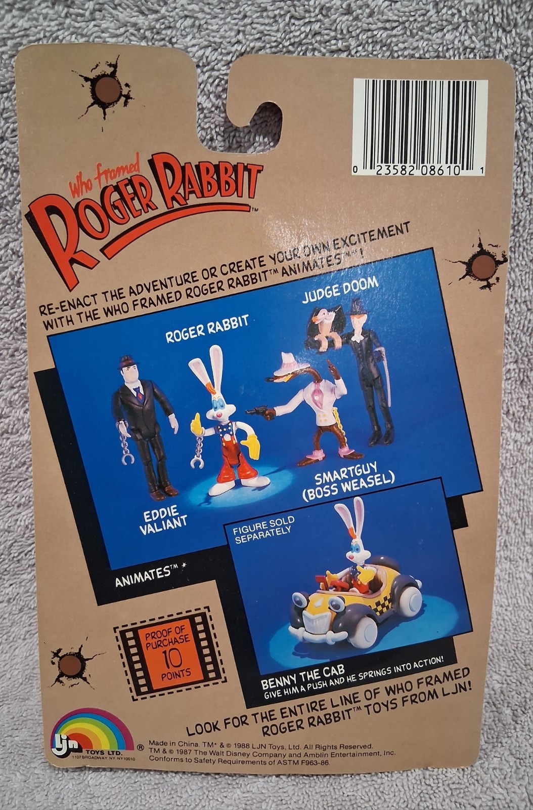 1988 NEW SEALED WHO FRAMED ROGER RABBIT ANIMATES JUDGE DOOM CARDED FULLY POSEABLE ACTION FIGURE LJN. My grandpa collected from the 1970s to 2000s. He loved Roger Rabbit and collected memorabilia from the movie. He bought this new and stored it in a box. It has never been opened, played with or displayed. It is in excellent condition. The cardback has a little lift. There is a minute bend on the left bottom corner. On the back side there is a small crease on the bottom left corner. The bubble is factory sealed to the cardback. The manufacturer's design does not allow for a complete seal at the bottom. That has allowed a tiny bit of dust and there is a small bug remain at Doom's right elbow. There are no cracks or dents. It is clear and not yellow. The vulture, cane and Doom are in excellent condition. Please view all photos and ask any questions prior to bidding as all sales are final.