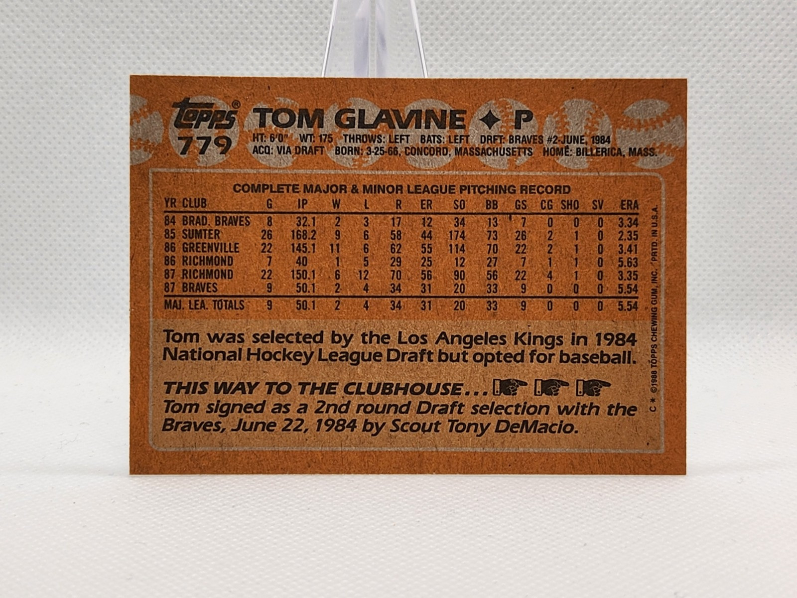 A 1988 Topps Tom Glavine Atlanta Braves rookie trading card (#779) featuring the MLB pitcher. This card is part of the 1988 Topps set and does not have an autograph. The card was manufactured by Topps and is a popular collectible item for sports trading card enthusiasts.