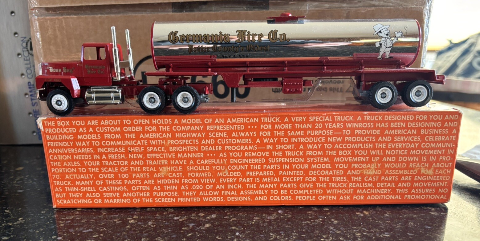 The rare Winross 1988 Germania Fire Co Tanker Truck is a 1:64 scale diecast model of a Ford 9000 tractor trailer in red with chrome accents. This special edition advertising specimen was made in the United States and features intricate details specific to the Germania Fire Co. The tanker truck is a vintage manufacture from 1988, showcasing the craftsmanship and quality associated with Winross products.