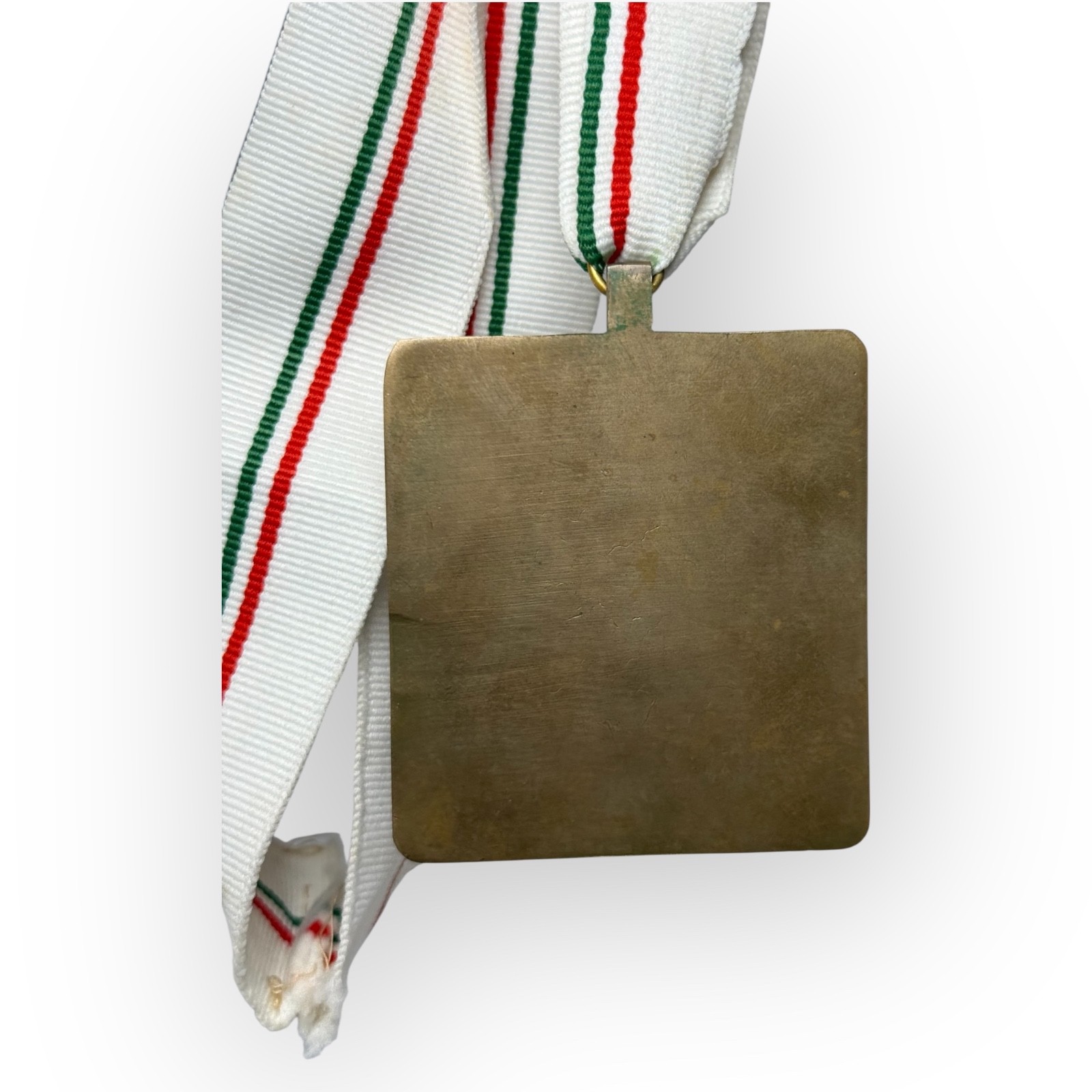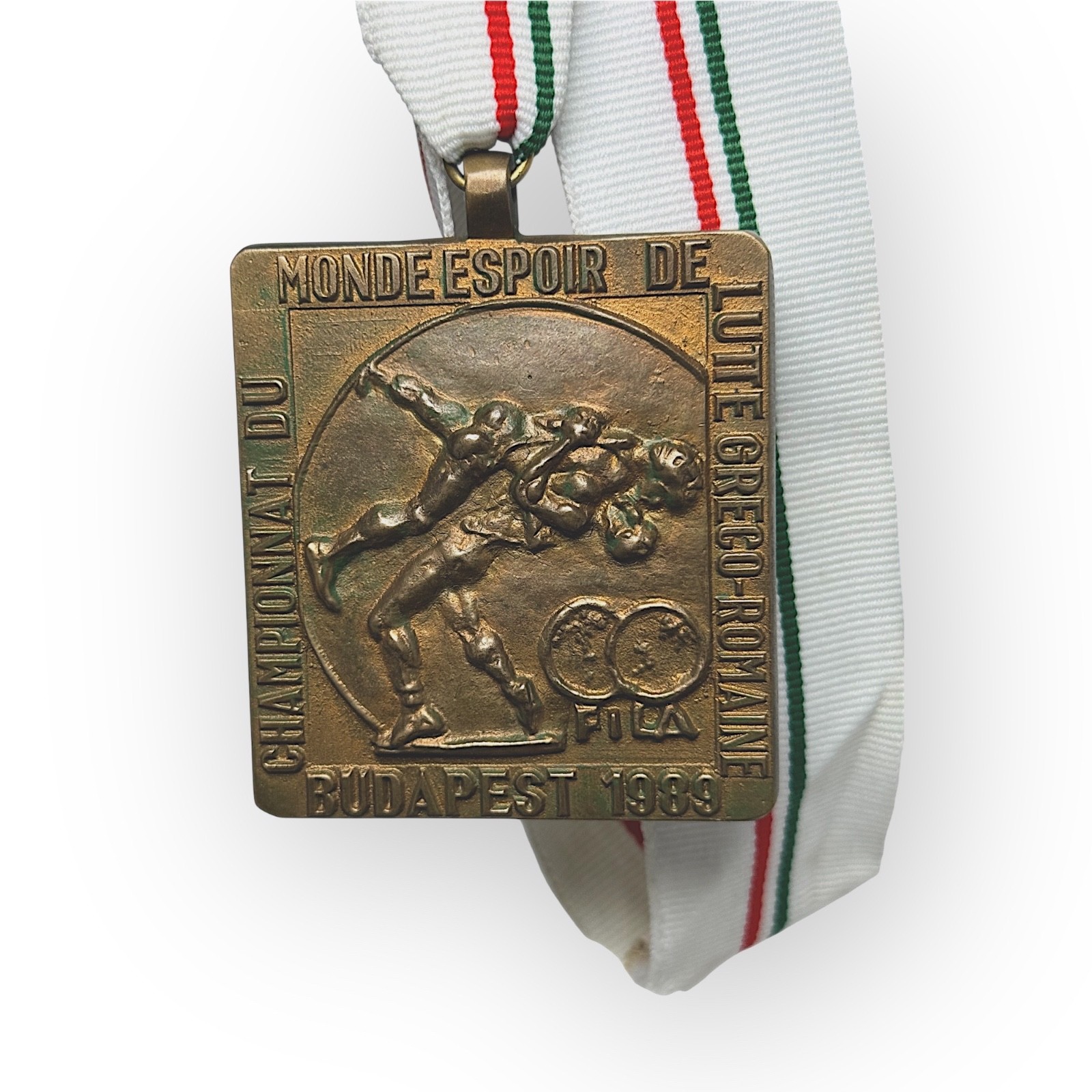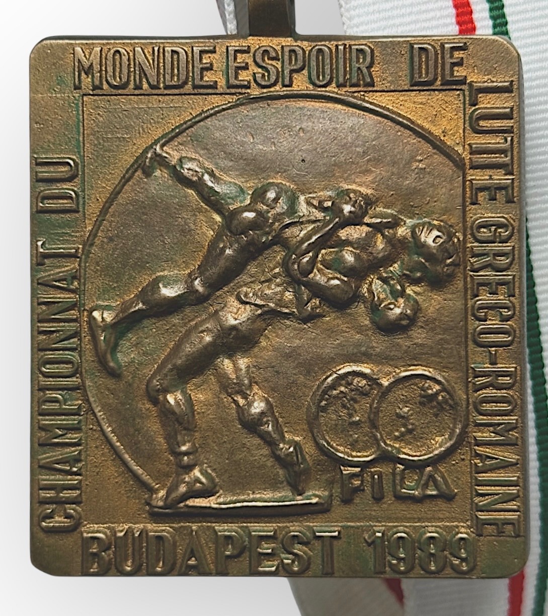 Gold Medal 🥇 at the FILA Junior World Championships in Greco-Roman wrestling. Event: Championnat du Monde Espoir de Lutte Gréco-Romaine (World Junior Greco-Roman Wrestling Championship) Fighter: Néstor Almanza Baró, won the world junior title in Budapest in Greco-Roman wrestling (lightweight category) Year: 1989 Location: Budapest, Hungary Organization: FILA (Fédération Internationale des Luttes Associées, now United World Wrestling) Shape: Rectangular with relief design Design (obverse) Central relief of two wrestlers in Greco-Roman combat French inscription: “CHAMPIONNAT DU MONDE ESPOIR DE LUTTE GRECO-ROMAINE – BUDAPEST 1989” FILA logo with Olympic rings Ribbon: White ribbon with red and green stripes (colors of Hungary) Condition: Vintage collectible medal, preserved with natural patina and minor signs of age Medalla de Oro 🥇 del Campeonato Mundial Juvenil (Junior World Championship) de la FILA en lucha grecorromana. Evento: Championnat du Monde Espoir de Lutte Gréco-Romaine (Campeonato Mundial Juvenil de Lucha Grecorromana) Luchador: Néstor Almanza Baró, ganó el título mundial juvenil de lucha grecorromana en Budapest (Hungría), en la categoría ligera (74 kg). Año: 1989 Lugar: Budapest, Hungría Organización: FILA (Fédération Internationale des Luttes Associées, hoy United World Wrestling) Forma: Rectangular con relieve Diseño (anverso) Relieve central de dos luchadores en combate grecorromano Inscripción en francés: “CHAMPIONNAT DU MONDE ESPOIR DE LUTTE GRECO-ROMAINE – BUDAPEST 1989” Logotipo de FILA con los anillos olímpicos Cinta: Cinta blanca con franjas rojas y verdes (colores de Hungría) Condición: Medalla vintage de colección, con pátina natural y leves marcas de antigüedad