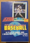 The product is a 1989 Score unopened wax box of baseball cards. It contains 36 packs of standard-sized sports trading cards from the Major League (MLB) season of 1989. The cards are part of the base set and were manufactured by SCORE. The box is a box configuration and was manufactured in 1989. This 660-card standard-size set was distributed by Major League Marketing. Cards feature six distinctive inner border (inside a white outer border) colors on the front. Subsets include Highlights (652-660) and Rookie Prospects (621-651). Rookie Cards in this set include Brady Anderson, Craig Biggio, Randy Johnson, Gary Sheffield, and John Smoltz 36 packs per box 16 cards per pack Look For Randy Johnson Rookies Look For John Smoltz Rookies Look For Gary Sheffield Rookies
