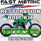1989-1994 Kawasaki KDX 200 Restoration Kit All Hardware Meets or exceeds OEM specs! This bolt kit has what you need to make accurate OEM repairs and restorations on your Kawasaki KDX 200 off-road motocross bike. FULL ENGINE: Crankcase Bolts and Drain Washer. Top End Kit including Cylinder Head Acorn Flange Nuts, Cylinder Base Nuts, Bolts for Reed Valve/Intake, Power Valve Covers, Exhaust Manifold, Water Neck, and OE match M6 Coolant Drain Bolts w Copper Washer. Left Side Engine Cover (Ignition) and Case Saver bolts. Right Side Engine Covers (Clutch 1pc or 2pc) with the Oil Check Bolt and Copper Washer. Water Pump including the Coolant Drain Bolt and Copper Washer CHASSIS/BODY: Exhaust Pipe Muffler and Silencer Mounting Bolts and Nuts. Frame includes Bolts and Nuts for Head Stay, Lower Subframe Bolts, Ignition Coil, and Motor Mount Nuts (Sorry no motor mount bolts or upper subframe bolt available). Front End includes all bolts for Upper and Lower Tripleclamps, handlebar clamps, Front Brake Caliper, Front Axel Pinch Bolts/Nuts, Front Number Plate, and Fork Guard Bolts. Front Brake Master Cylinder contains Bolts for Perch, Brake Fluid Reservoir Cover Screws, and a new Fuji Lock nut for your Lever pivot bolt. Front Fender Bolts, Collars, and Fender Washers. Front & Rear Brake Rotors Bolts. Fuel Tank Mounting Bolts for Tank, Radiator Shroud Bolts and Collars, and Petcock. Throttle / Clutch Perch Bolts and Pivot Nuts. Shifter / Kick Start bolt. Radiator Mounting Bolts and Washers. Rear Brake Guard Bolts. Rear Brake Master Cylinder and Reservoir Bolts. Rear Fender Mounting Bolts, Washers, and Lock Nuts. Rear Wheel Sprocket Bolt and Chain Adjuster Bolt Sets. Seat / Side Panels Mounting Bolts and Collars. Swing Arm Hardware for Chain Guide, Chain Slider, Chain Rollers, and Brake Line Guides. NOT INCLUDED: Main Motor Mounts, Axles, or Rear Suspension, and Subframe Bolts. All our fasteners are made of high quality heat-treated zinc plated steel. They have been designed and tested to meet or exceed OEM specifications. We guarantee fit and function. Your complete satisfaction is our number one goal! *Compare to Specbolt & Save $$$$$* APPLICATIONS: 1989-1994 Kawasaki KDX 200 Models Your satisfaction is GUARANTEED IF YOU ARE NOT 100% COMPLETELY SATISFIED WITH YOUR FASTENER KIT, YOU MAY RETURN IT WITHIN 30 DAYS OF PURCHASE, OR CONTACT US FOR AN EXCHANGE OR REPLACEMENT! -PAYMENT & SHIPPING- Payment is required upon checkout. FREE DOMESTIC PRIORITY MAIL SHIPPING Check out our other fastener kits for YAMAHA, HONDA, KAWASAKI, SUZUKI, HUSQVARNA, & KTM