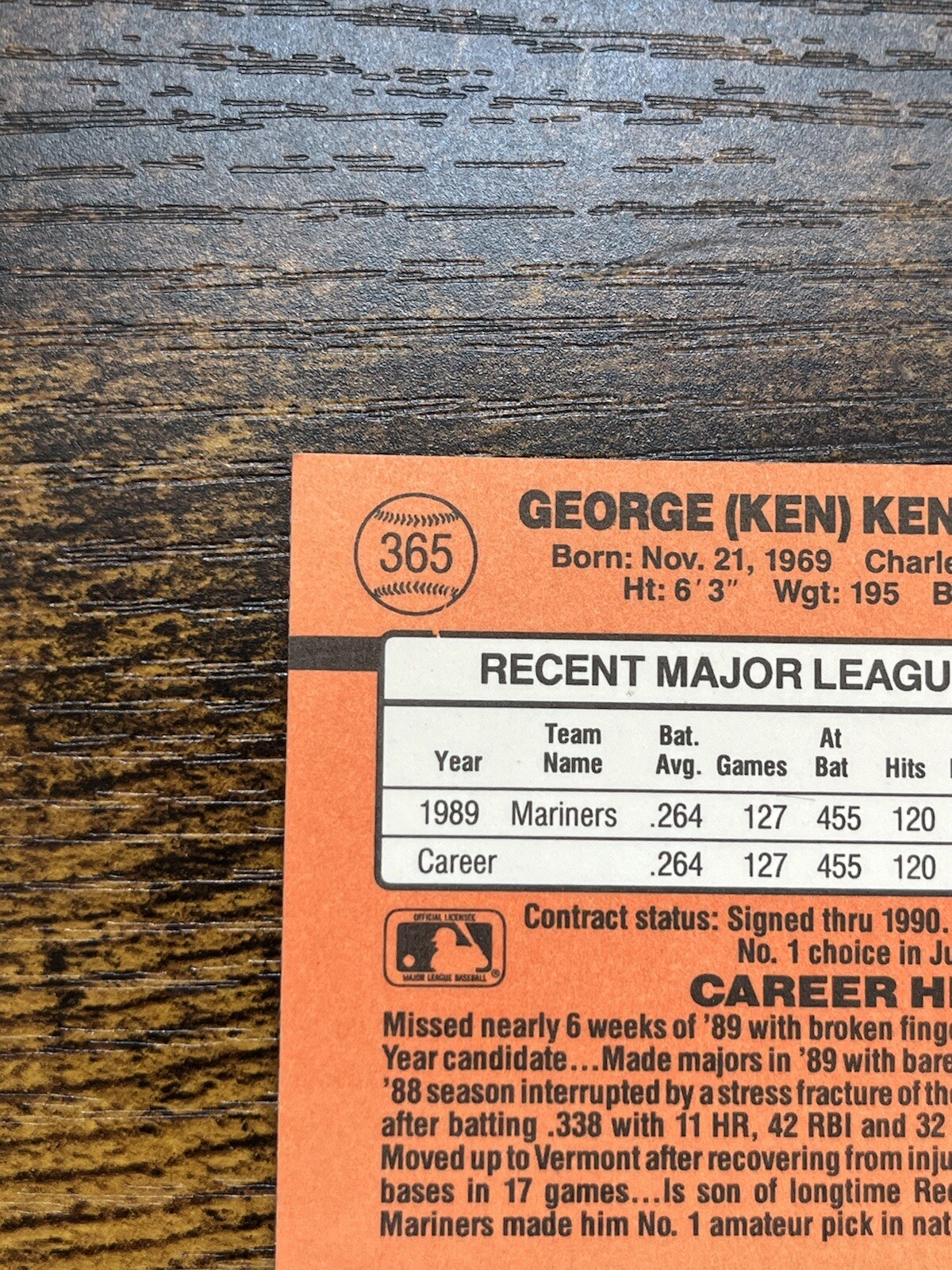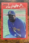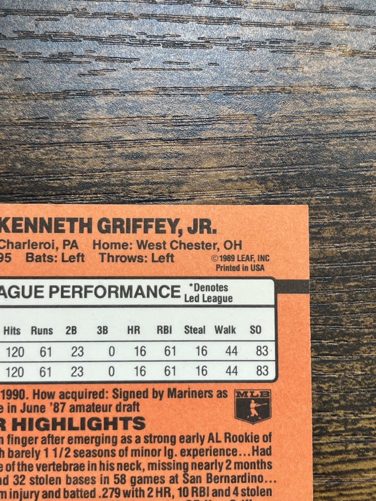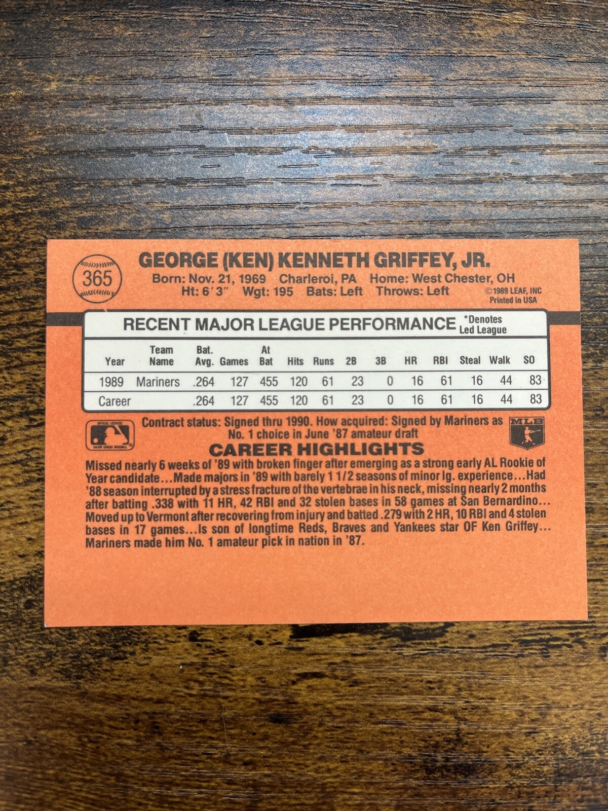 This is a rare and highly sought-after 1990 Donruss Ken Griffey Jr. #365 trading card. It features multiple misprints and errors including the line bump before the G, Donruss logo, baseball 365 error, gap in black line on back, no period after OH several blue and pink dots. This card has all of the errors and more, making it a unique and valuable addition to any collection. The card is made of high-quality paperboard and card stock materials and has a red parallel/variety.This card is an original and licensed reprint from the Major League Baseball (MLB) World Series event/tournament. It is a short print with memorabilia features and is in English language. The card is from the Seattle Mariners team and the 1990 season.