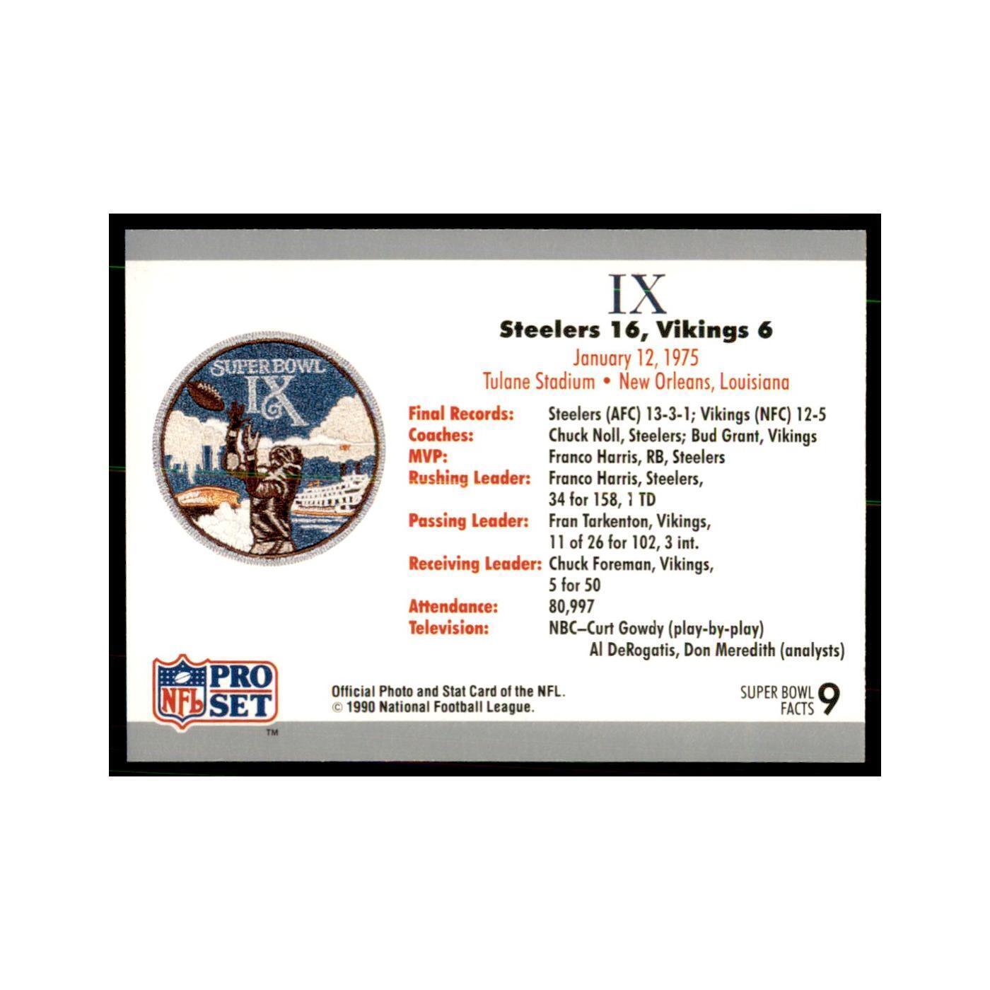 1990 Pro Set Silver Anniversay Commemorative SB IX Ticket #9 This card is in near-mint condition or better. You will receive the exact card in the scans. Shipping Please note that free standard shipping is sent via eBay standard labels in a plain brown or white envelope. All free standard shipments use penny sleeves and top loaders to protect the cards. There is no tracking using these labels it will say shipped and delivered only. You can view the information by clicking the link in your order. Please be advised that it can take at least two weeks in some cases for the PWE to arrive please do not contact us before then as we will not have any information to give you. If you need it sooner we can provide shipping via any shipping provider for an additional cost. WE BUY COLLECTIONS We are always on the lookout so feel free to contact us. Listing and template services provided by inkFrog