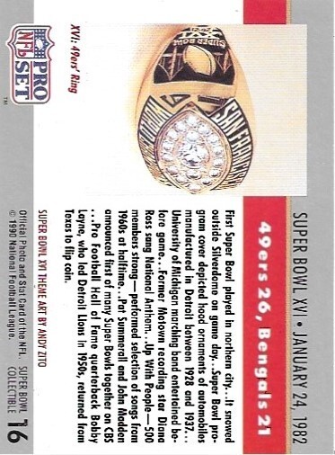 The product is a 1990 Pro Set Super Bowl Collectibles trading card featuring Super Bowl XVI. This sports trading card commemorates the Super Bowl championship won by the San Francisco 49ers in 1990. The card is part of the 1990 Pro Set set and is a parallel variety specifically designed for Super Bowl collectors. It does not feature an autograph but is a valuable piece for fans of football and NFL memorabilia.