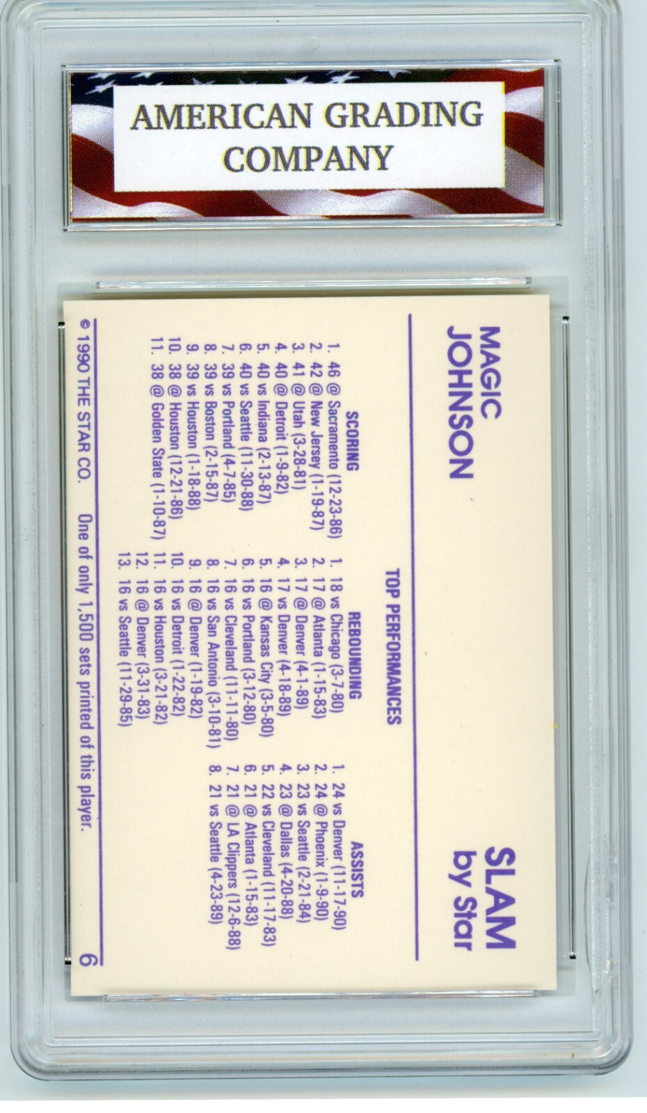 1990 Star Slam #6 Magic Johnson AGC 10 Gem Mint Los Angeles Lakers Rare only 1500 printed. Quality Singles is full time sports collectibles dealer. Your order will be professionally packaged. We strive to deliver a 5-star service. Please contact us with any issues. Shipping for graded cards is a flat fee of $3.99, no matter how many cards are bought . Thank-You.