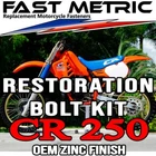 1990-1991 CR 250 Restoration Kit All Hardware Meets or exceeds OEM specs! This bolt kit has what you need to make accurate OEM repairs and restorations on your Honda CR 250 off-road motocross bike. FULL ENGINE: Crankcase Bolts and Drain Washer. Top End Kit including 9 Cylinder Head Acorn Flange Nuts paired with 9 Copper Crush Washers, Cylinder Base Nuts, Bolts for Reed Valve/Intake, Power Valve Covers, Exhaust Manifold, Water Neck, and OE match M6 Coolant Drain Bolts w Copper Washer. Left Side Engine Cover (Ignition) and Case Saver bolts. Right Side Engine Covers (Clutch 1pc or 2pc) with the Oil Check Bolt and Copper Washer. Water Pump including the Coolant Drain Bolt and Copper Washer CHASSIS/BODY: Exhaust Pipe Muffler and Silencer Mounting Bolts and Nuts. Frame includes Bolts and Nuts for Head Stay, Lower Subframe Bolts, Ignition Coil, and Motor Mount Nuts (Sorry no motor mount bolts or upper subframe bolt available). Front End includes all bolts for Upper and Lower Tripleclamps, handlebar clamps, Front Brake Caliper, Front Axel Pinch Bolts/Nuts, Front Number Plate, and Fork Guard Bolts. Front Brake Master Cylinder contains Bolts for Perch, Brake Fluid Reservoir Cover Screws, and a new Fuji Lock nut for your Lever pivot bolt. Front Fender Bolts, Collars, and Fender Washers. Front & Rear Brake Rotors Bolts. Fuel Tank Mounting Bolts for Tank, Radiator Shroud Bolts and Collars, and Petcock. Throttle / Clutch Perch Bolts and Pivot Nuts. Shifter / Kick Start bolt. Radiator Mounting Bolts and Washers. Rear Brake Guard Bolts. Rear Brake Master Cylinder and Reservoir Bolts. Rear Fender Mounting Bolts, Washers, and Lock Nuts. Rear Wheel Sprocket Bolt and Chain Adjuster Bolt Sets. Seat / Side Panels Mounting Bolts and Collars. Swing Arm Hardware for Chain Guide, Chain Slider, Chain Rollers, and Brake Line Guides. All our fasteners are made of high quality heat-treated zinc plated steel. They have been designed and tested to meet or exceed OEM specifications. We guarantee fit and function. Your complete satisfaction is our number one goal! *Compare to Specbolt & Save $$$$$* APPLICATIONS: 1990-1991 Honda CR 250 Models Your satisfaction is GUARANTEED IF YOU ARE NOT 100% COMPLETELY SATISFIED WITH YOUR FASTENER KIT, YOU MAY RETURN IT WITHIN 30 DAYS OF PURCHASE, OR CONTACT US FOR AN EXCHANGE OR REPLACEMENT! -PAYMENT & SHIPPING- Payment is required upon checkout. FREE DOMESTIC PRIORITY MAIL SHIPPING Check out our other fastener kits for YAMAHA, HONDA, KAWASAKI, SUZUKI, HUSQVARNA, & KTM