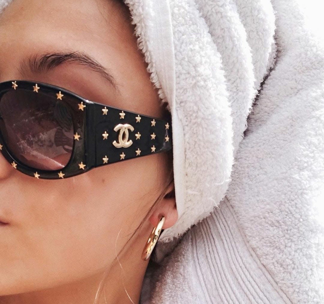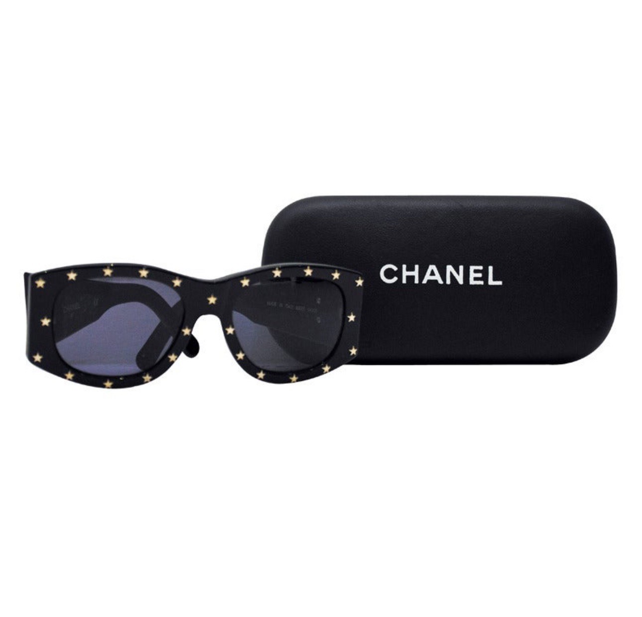 1990s Black rectangle-frame sunglasses Star stud embellishment with the brand’s signature interlocking CC logo Tinted lenses Comes with Chanel hard case sunglasses case. These are extremely rare find. In very good vintage condition. Authenticity guaranteed.