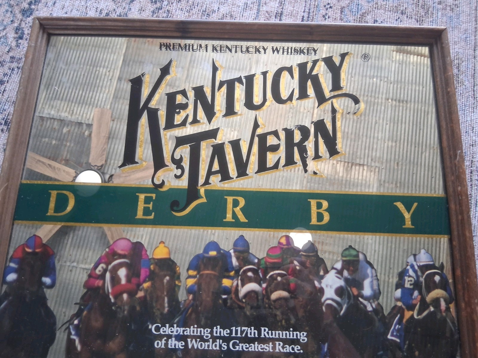 The product is a vintage 1991 Kentucky Tavern Derby Whiskey mirror advertising the Kentucky Derby horse racing event. This officially licensed mirror features a multi-color design and is a great collectible for fans of horse racing, specifically the Kentucky Derby. It is targeted towards unisex adults and would make a unique and nostalgic addition to any sports memorabilia collection. 16.5 inches x 20.5 inches! Great condition! Great bar mirror!