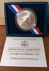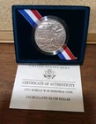 Immerse yourself in a piece of history with the 1991 Korean War Memorial Commemorative Silver Dollar. Struck at the Philadelphia Mint, this stunning coin is a testament to the valor and sacrifice of those who served. The proof finish exhibits the finest details, from the obverse portraying Liberty to the reverse featuring the iconic Korean War Memorial. With its 0.9 fineness, the silver composition shines brilliantly, and being uncirculated, it's preserved in pristine condition. Accompanied by the original box and Certificate of Authenticity from the U.S. Mint, this coin is a treasured addition to any collection, commemorating an important chapter in American history.