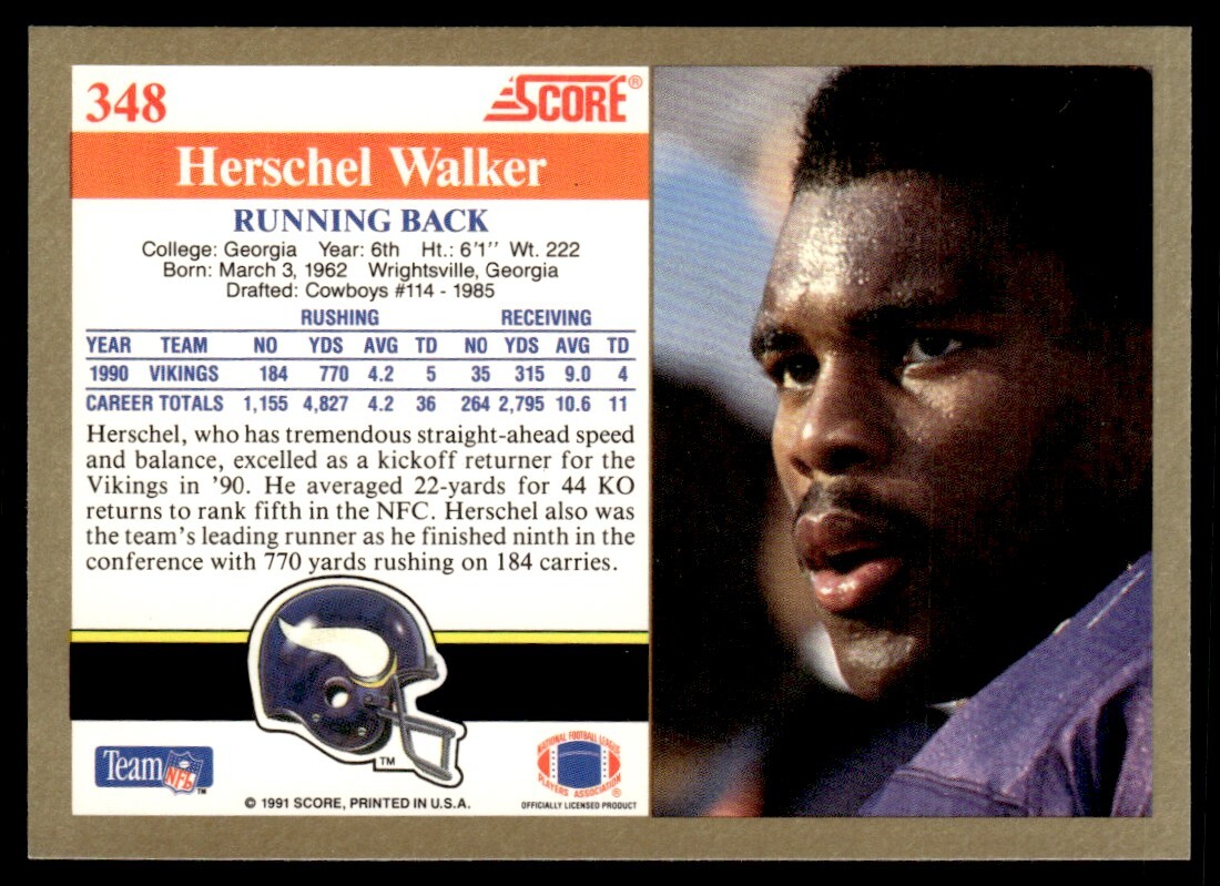 About Me Other Listings Feedback Add to Favorites Contact Me Mesplay Enterprises 1991 Score Herschel Walker Minnesota Vikings #348 No stock photo / These are real scans or pictures Details Description: Herschel Walker Category: Football Year: 1991 Product: Score Team: Minnesota Vikings Card Number: 348 Dimensions: 3½" x 2½" SKU: FT B0001 R16 C (72) Listing By Kronocard trading cards software v2.7.0.1