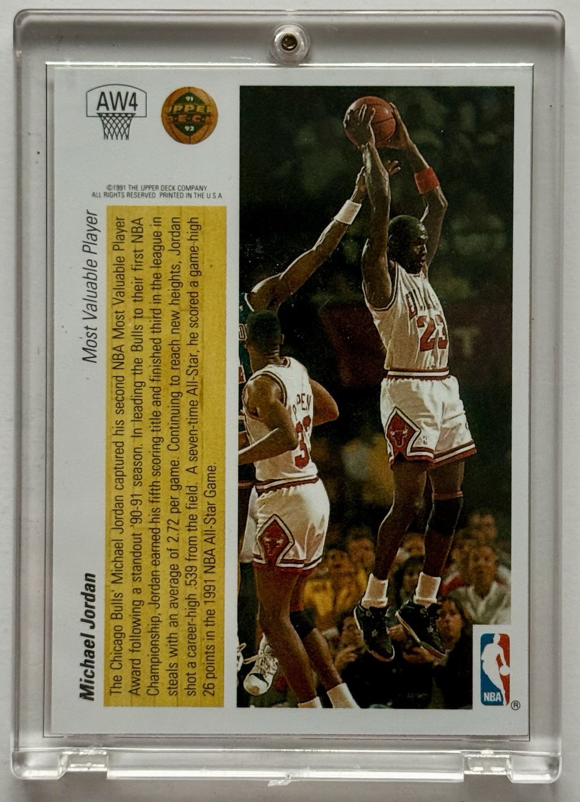 The 1991 Upper Deck Hologram with Michael Jordan's MVP # AW4 is a vintage sports trading card from the National Basketball Association (NBA) featuring one of the greatest players in the league's history. This original card is made of card stock with a thickness of 20 Pt., and it showcases a hologram feature. This collectible item represents a piece of basketball history from the 1991 NBA Finals, showcasing the iconic Chicago Bulls team and the talented athlete who led them to victory.