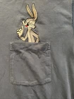 This vintage Warner Bros t-shirt features the iconic duo of Marvin the Martian and Bugs Bunny from the Looney Tunes franchise. The shirt is a size medium and has a regular fit. It is blue in color and has embroidered accents. The shirt is in great condition and is perfect for any fan of the Looney Tunes or vintage clothing. It is a rare piece that will make a great addition to any collection. The shirt is made for men and is a type of T-shirt.