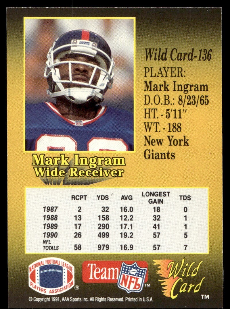 About Me Other Listings Feedback Add to Favorites Contact Me eBay Store JEm_Mint_Trading 1991 Wild Card Mark Ingram New York Giants #136 No stock photo / These are real scans or pictures Details Description: Mark Ingram Category: Football Year: 1991 Product: Wild Card Team: New York Giants Card Number: 136 Dimensions: 3½" x 2½" SKU: FT A0011 R03 K (1) Listing By Kronocard trading cards software v2.8.2.3