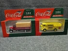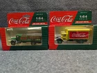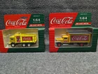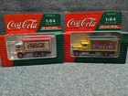 The product is a set of 1991 Coca-Cola die-cast delivery trucks in 1:64 scale, featuring models from brands like Mack, Peterbilt, Ford, and GMC. The trucks are multi-colored and were manufactured in China by Mattel. This collectible set includes 10 trucks, each adorned with Coca-Cola branding, making them a unique and nostalgic piece for fans of soda advertising and vintage vehicles. The trucks serve as a representation of the theme of soda delivery and are original pieces from 1991.