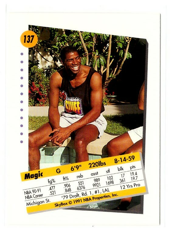 The product is a 1991-92 Skybox trading card featuring Magic Johnson of the Los Angeles Lakers from the National Basketball Association (NBA). This particular card is part of the base set and is card number 137 in the collection. The card is a sports trading card manufactured by SkyBox, known for their basketball card sets. It is a collectible item for fans of Magic Johnson and the NBA, offering a piece of sports memorabilia from the 1991-92 season.