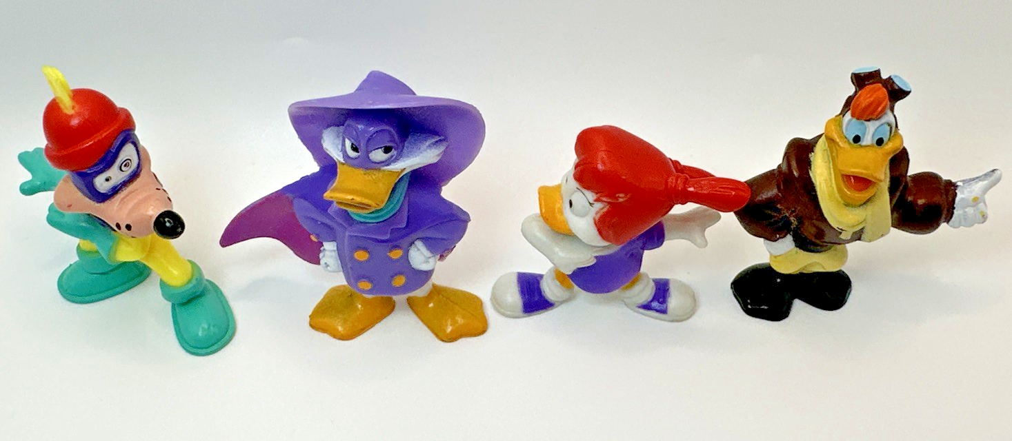 Some minor wear from age and play but still in excellent condition please see photos This is a rare vintage set of 4 Darkwing Duck toys from McDonald's, released in 1994. The set includes all the original pieces and is a complete unit. The characters are from the popular Disney series and are perfect for collectors and fans alike. The brand is prominently displayed on each piece, making it a great addition to any collection. Don't miss out on this opportunity to own a piece of fast food history.