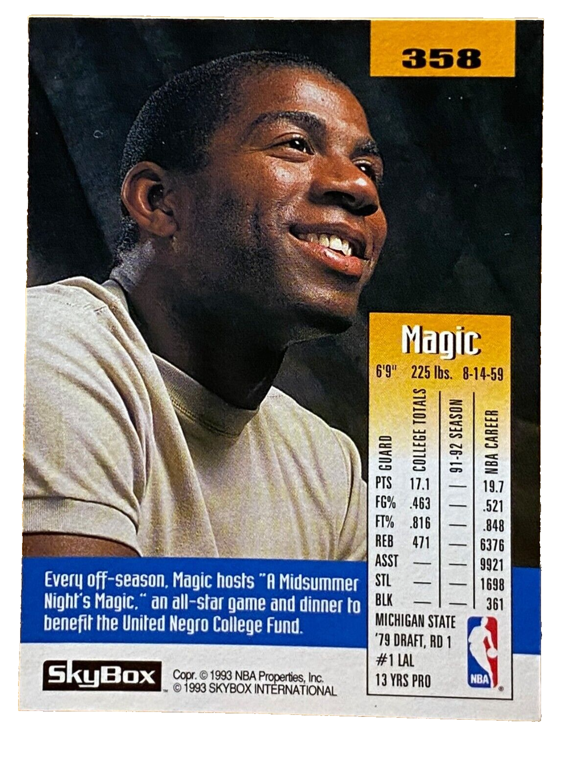 This 1992 SkyBox sports trading card features Earvin Johnson, also known as Magic Johnson, who played for the Los Angeles Lakers in the NBA. The card is numbered 358 and is a standard size for easy collection. It was manufactured in the United States by SkyBox in 1992, making it a vintage item for basketball fans. The card is not autographed and is part of the 1992 season set. It is a great addition to any sports trading card collection, especially for fans of the Los Angeles Lakers and Earvin Johnson.